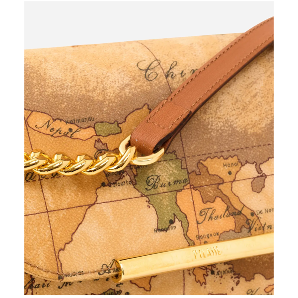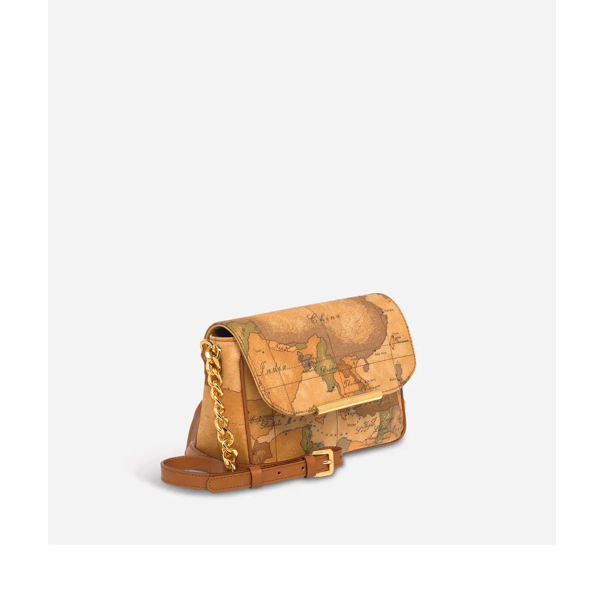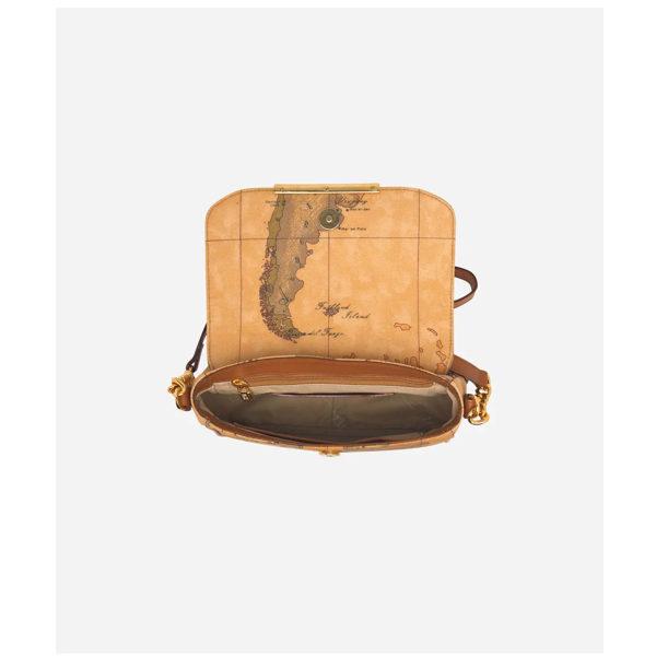 Borsa Alviero Martini 1’Classe D0726000 colore geo classic. Borsa mini a tracolla in tessuto stampato con cartina geografica Geo Classic. Metalleria con logo 1ᴬ Classe e finiture in oro chiaro. Riporti e dettagli in pelle di color cuoio.
