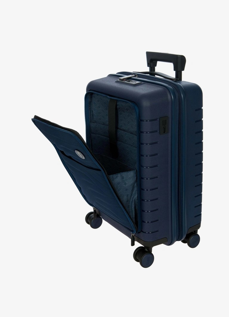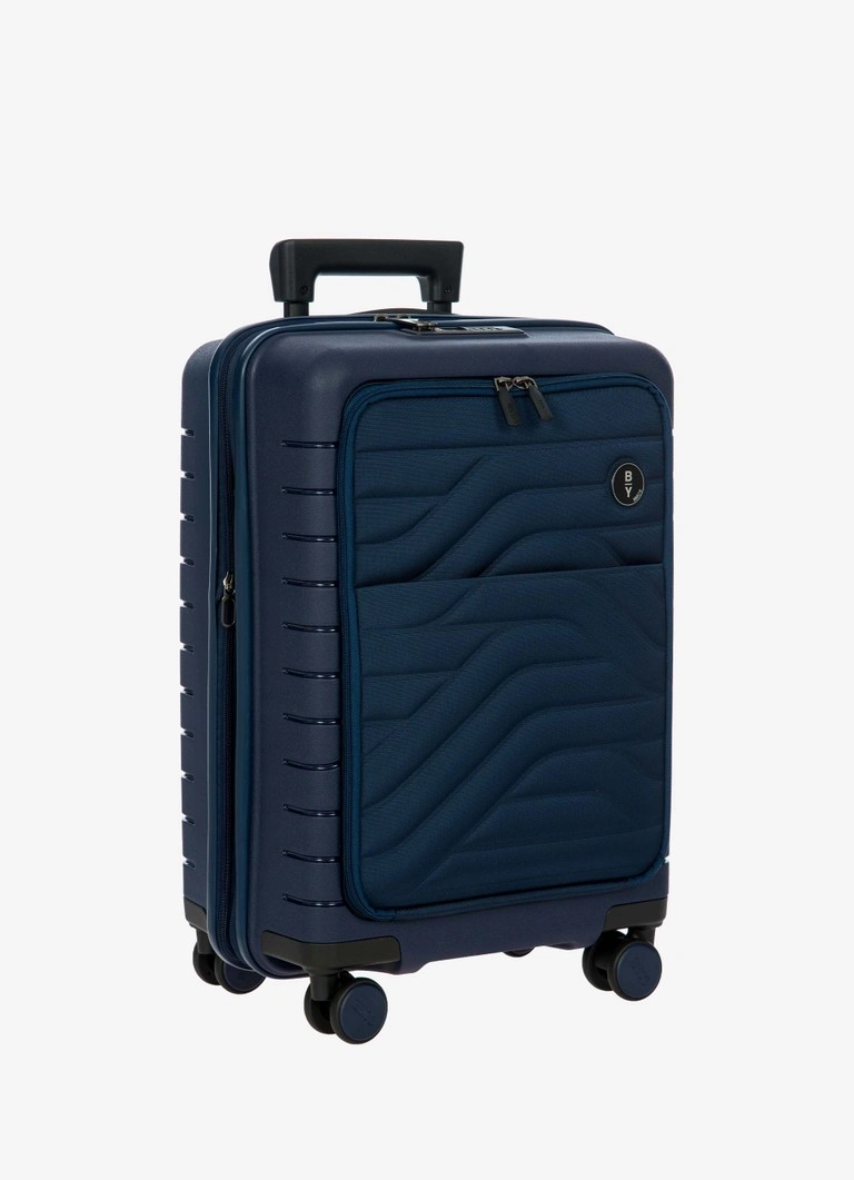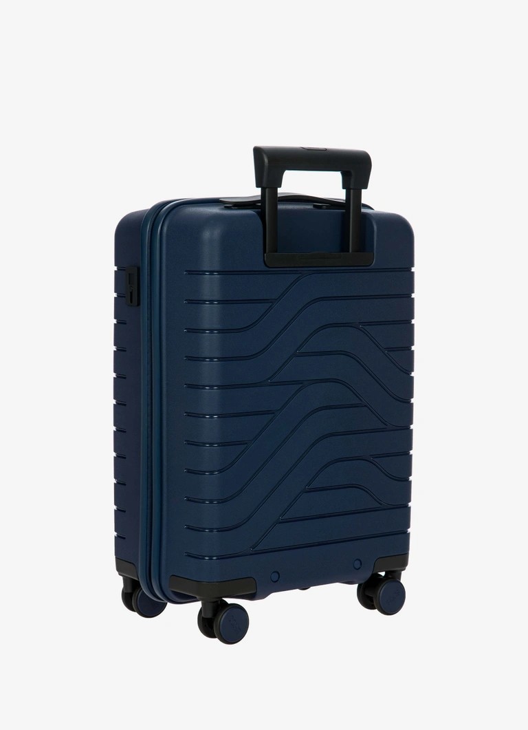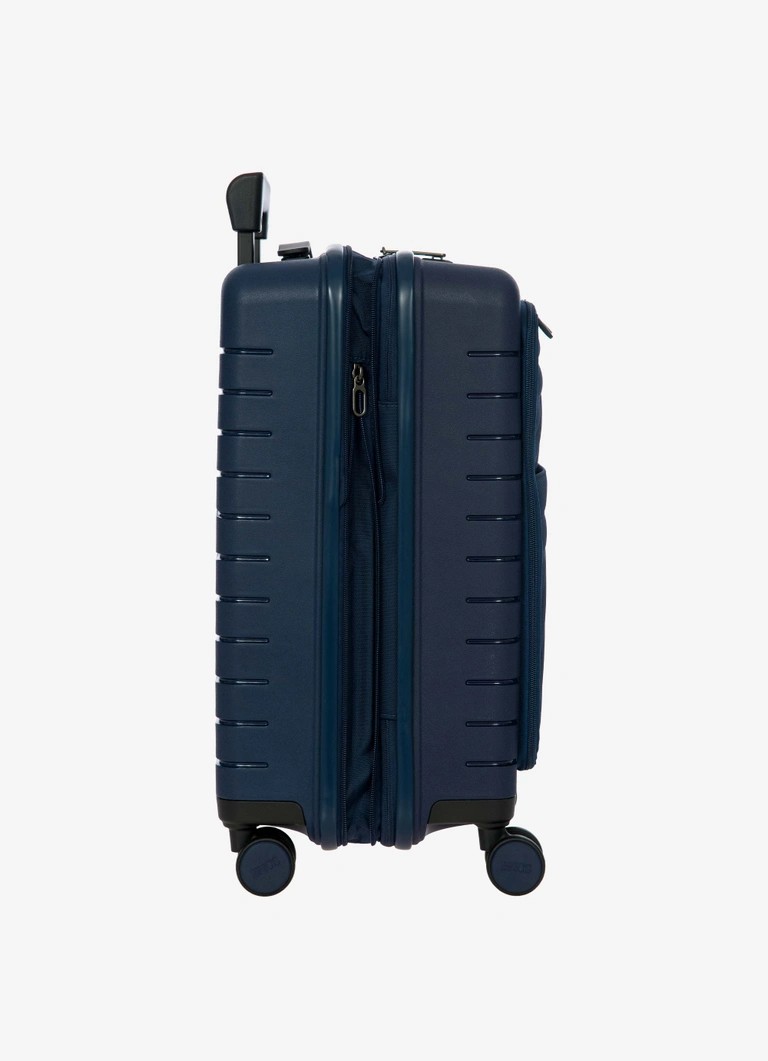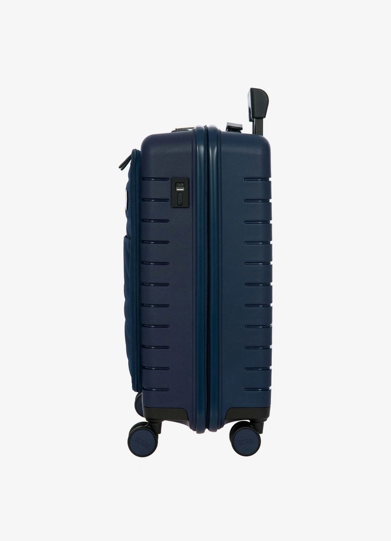 Trolley da cabina espandibile con tasca della collezione Ulisse B|Y Bric’s. Funzionale con un look moderno, il trolley con tasca รจ lโideale per le necessitร dei viaggi di lavoro ma non solo. Questo bagaglio assicura robustezza e un design sofisticato, grazie allโabbinamento tra il polipropilene del guscio rigido e il tessuto morbido ma resistente con cui รจ costruita la tasca frontale, che rivela una tasca imbottita porta pc e tablet, con nastro di protezione. ESTERNO: guscio realizzato in polipropilene, per assicurare la massima leggerezza, flessibilitร e resistenza, con tasca frontale con zip per contenere gli oggetti da tenere a portata di mano. Chiusura lampo con serratura TSA a combinazione integrata nel guscio. Zip per ampliare la profonditร del trolley di 4 cm all’occorrenza. MANIGLIA: comoda e funzionale maniglia di traino con tubi in alluminio, con tre posizioni di stop intermedio attivabili con un bottone a pressione. La maniglia superiore รจ piatta ed ergonomica.INTERNO: compartimento con zip e tasca piatta a rete da un lato, nastri per bloccare l’abbigliamento dall’altro. Fodera in morbido poliestere. Tasca dedicata contenente bustina removibile e lavabile per riporre scarpe o bucato.RUOTE: quattro ruote doppie incassate per ottimizzare il volume del bagaglio, permettono un’agevole rotazione a 360ยฐ assicurando la massima silenziositร grazie al loro rivestimento in gomma. DETTAGLI: design esterno caratterizzato da un bassorilievo di ispirazione urbana, lo stesso disegno รจ ripetuto anche sulla fodera interna. Dettagli logati su tiralampo, su maniglia di sollevamento e sulle ruote, in tinta con il colore del guscio. Porta indirizzi integrato.