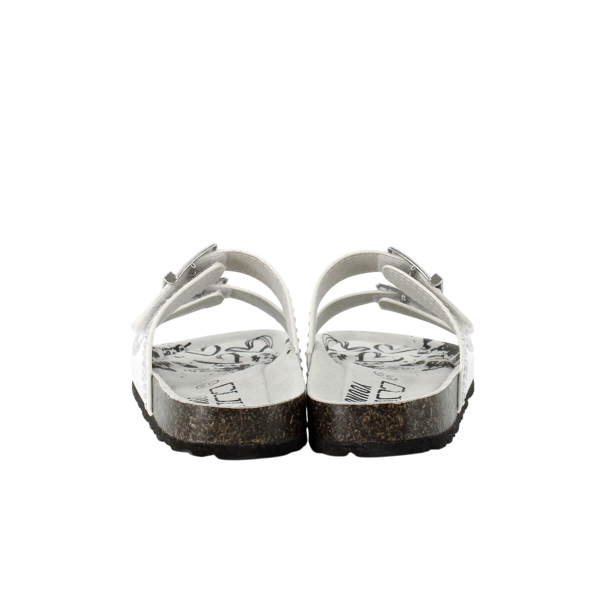 Ciabatte Cult Young T-221 colore bianco. Le ciabatte Cult Young T-221 nel colore bianco sono la scelta ideale per chi cerca uno stile moderno e grintoso senza rinunciare al comfort quotidiano. Realizzate con materiali di qualità, queste ciabatte presentano una doppia fascia con fibbie regolabili, impreziosite da piccole borchie metalliche che aggiungono un tocco rock chic al design. Il plantare anatomico e la suola effetto sughero assicurano un appoggio naturale e stabile, rendendole perfette per l’uso quotidiano, sia in casa che all’aperto. Il fondo in gomma garantisce aderenza su ogni superficie.