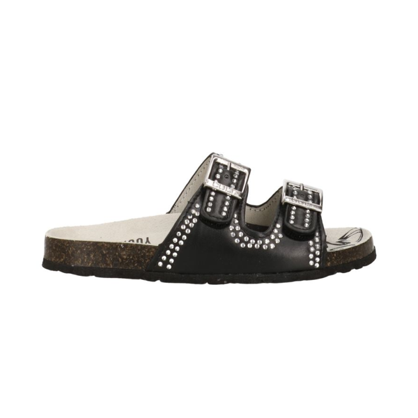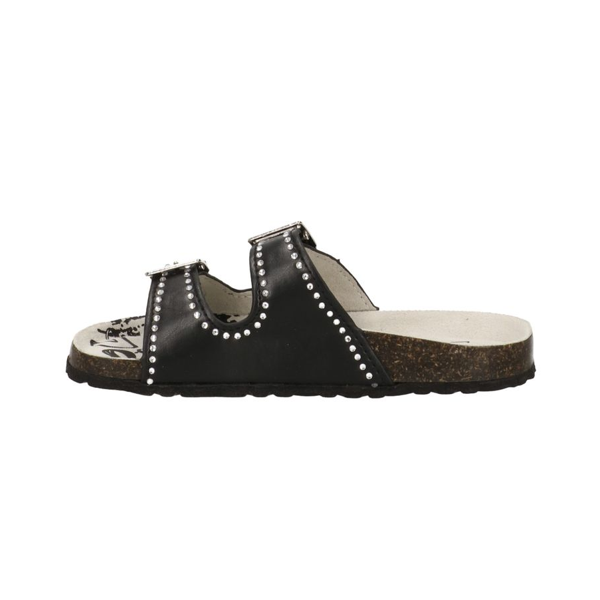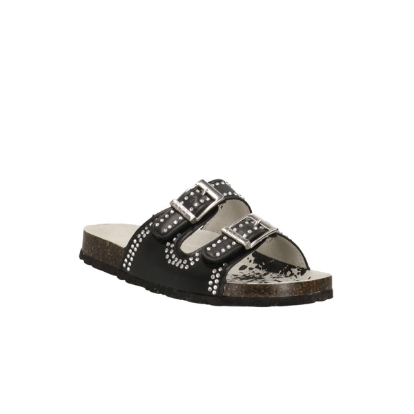 Ciabatte Cult Young T-221 colore nero. Le ciabatte Cult Young T-221 nel colore nero sono la scelta ideale per chi cerca uno stile moderno e grintoso senza rinunciare al comfort quotidiano. Realizzate con materiali di qualità, queste ciabatte presentano una doppia fascia con fibbie regolabili, impreziosite da piccole borchie metalliche che aggiungono un tocco rock chic al design. Il plantare anatomico e la suola effetto sughero assicurano un appoggio naturale e stabile, rendendole perfette per l’uso quotidiano, sia in casa che all’aperto. Il fondo in gomma garantisce aderenza su ogni superficie.