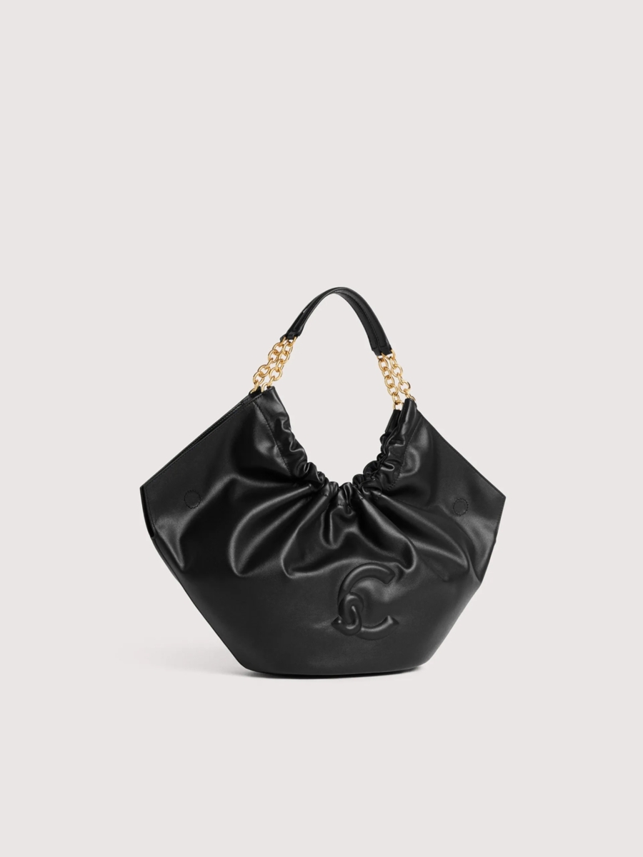 Pelle liscia Chiusura con magneti Dettaglio logo C-Me in alta frequenza Manico in catena con inserto pelle Tasca interna con zip Galvanica gold