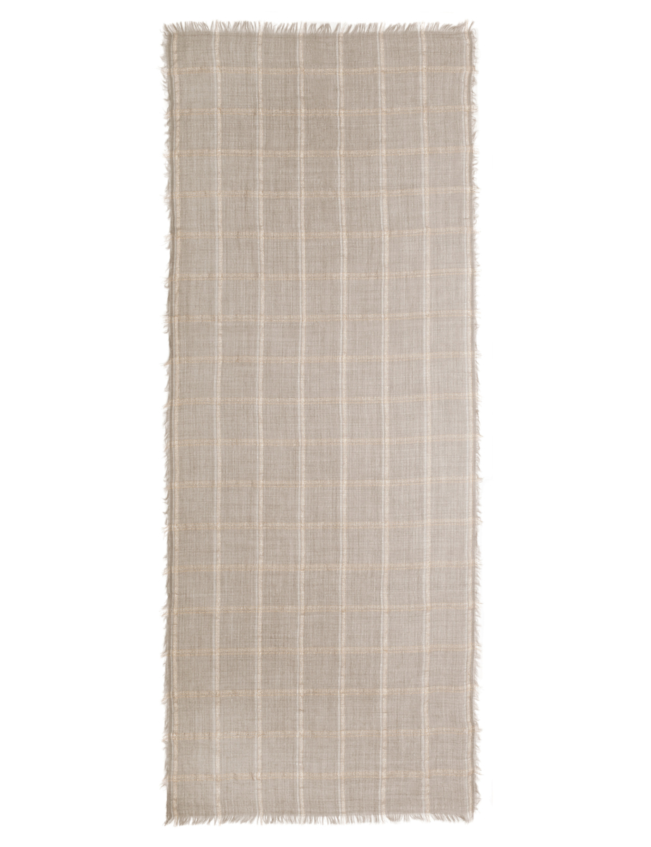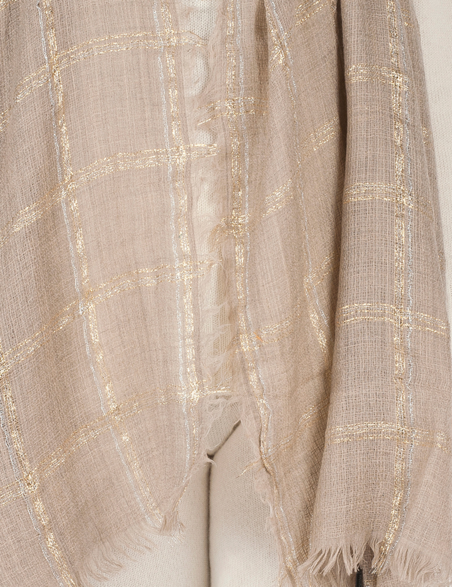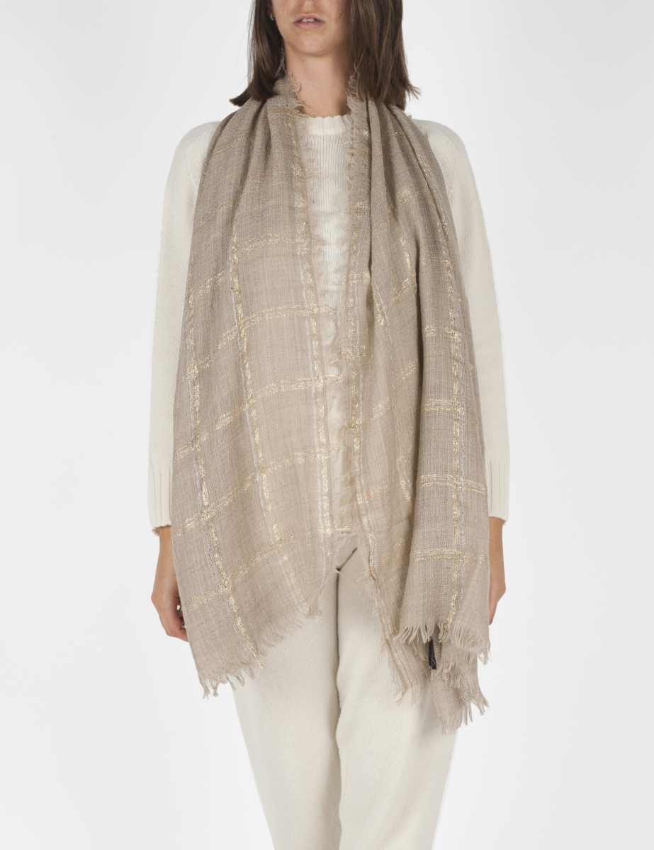 Sofisticata stola in lana realizzata in tinto filo ed impreziosita da un disegno check combinato da un mix di fili metallizzati oro ed argento. Microfrange sui quattro lati completano il look. 92% Lana 8% Filo Metalizzato Made in India