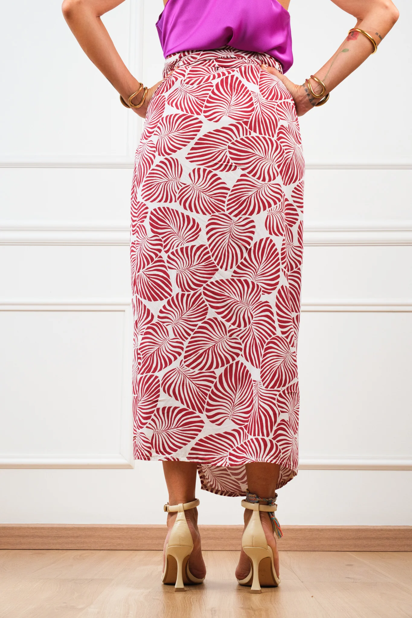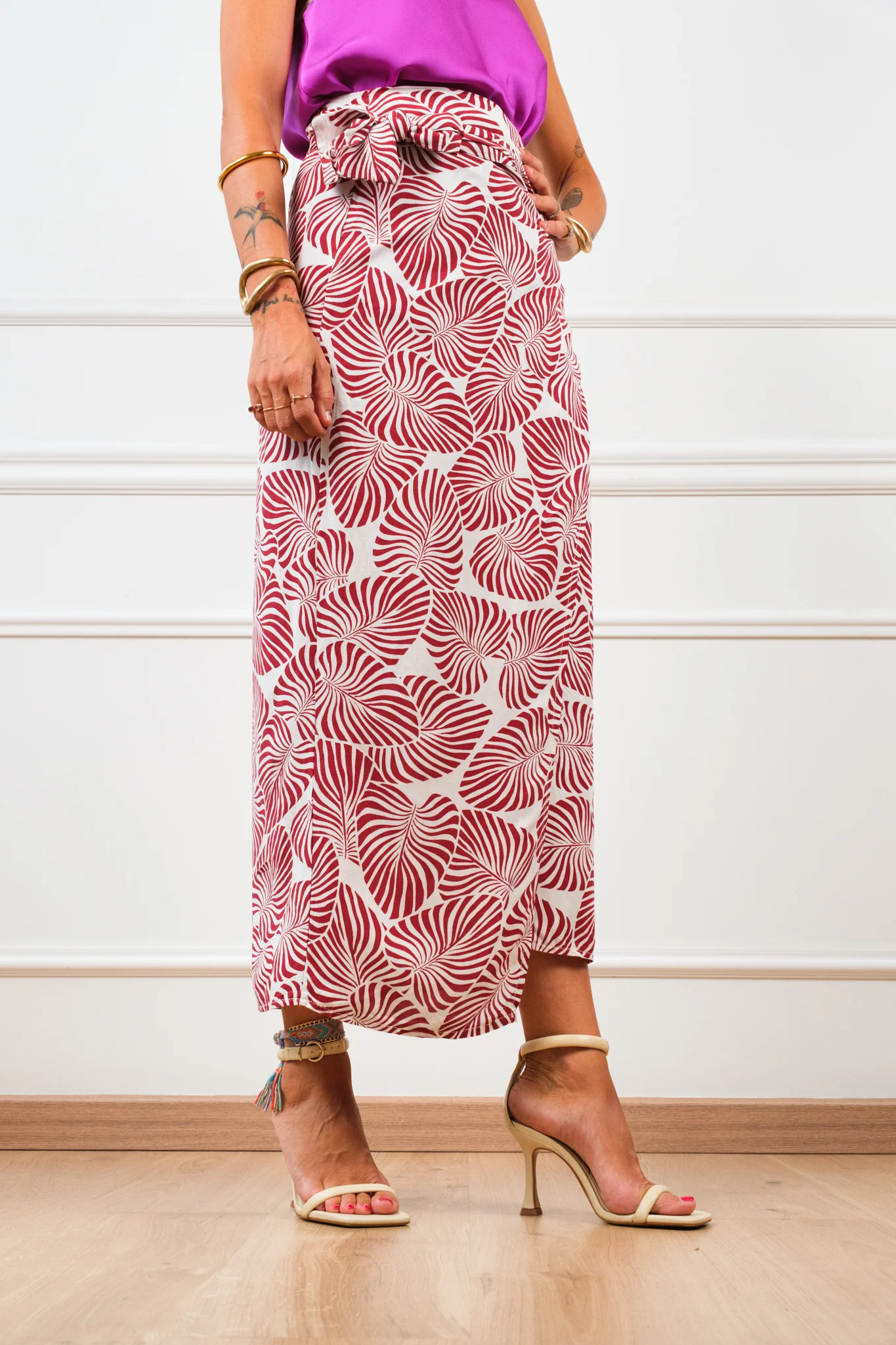 Composizione: 72% viscosa, 28% lino. La gonna รจ a portafoglio. Lunghezza: S/M: 91 cm M/L: 93 cm