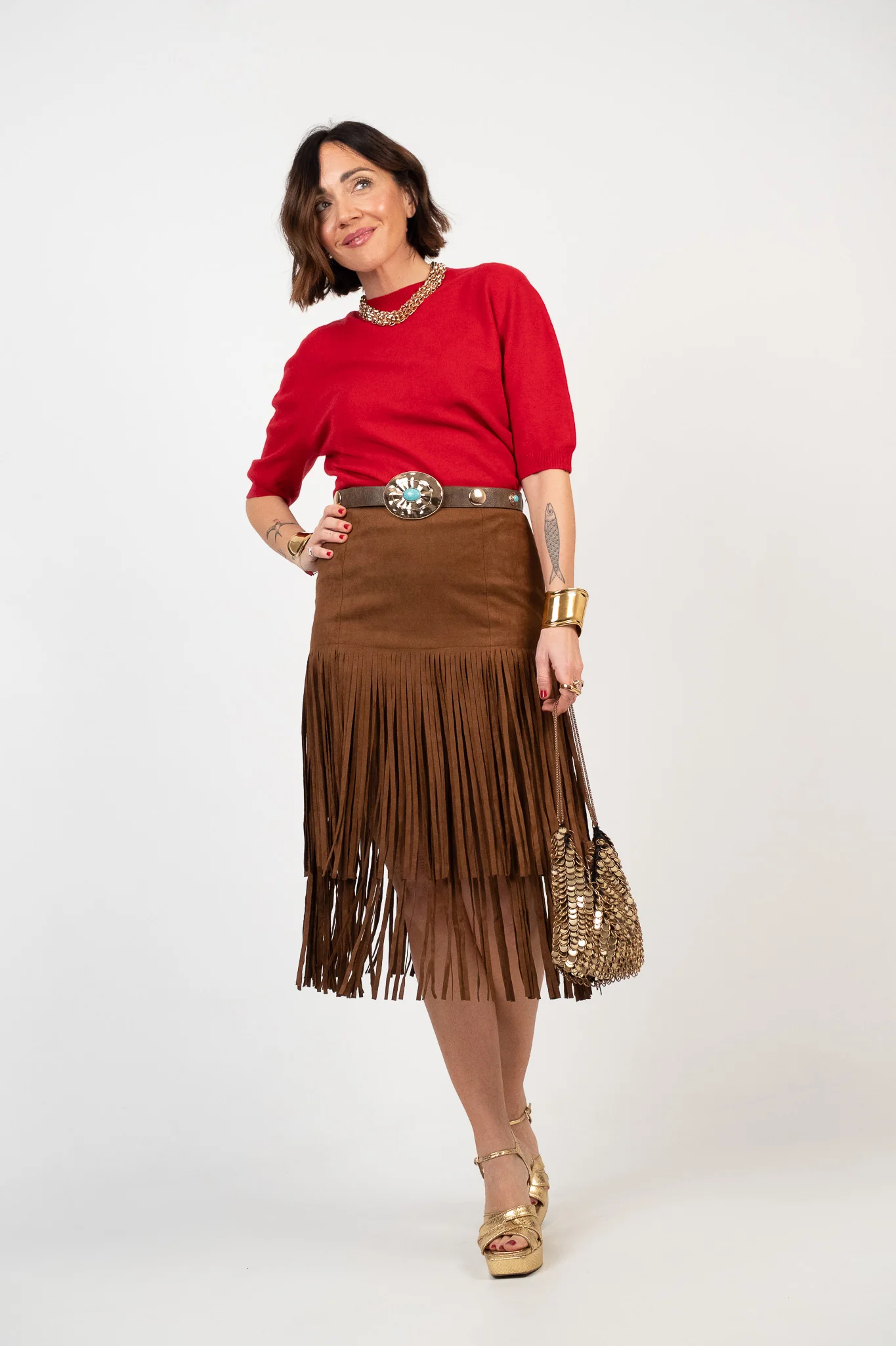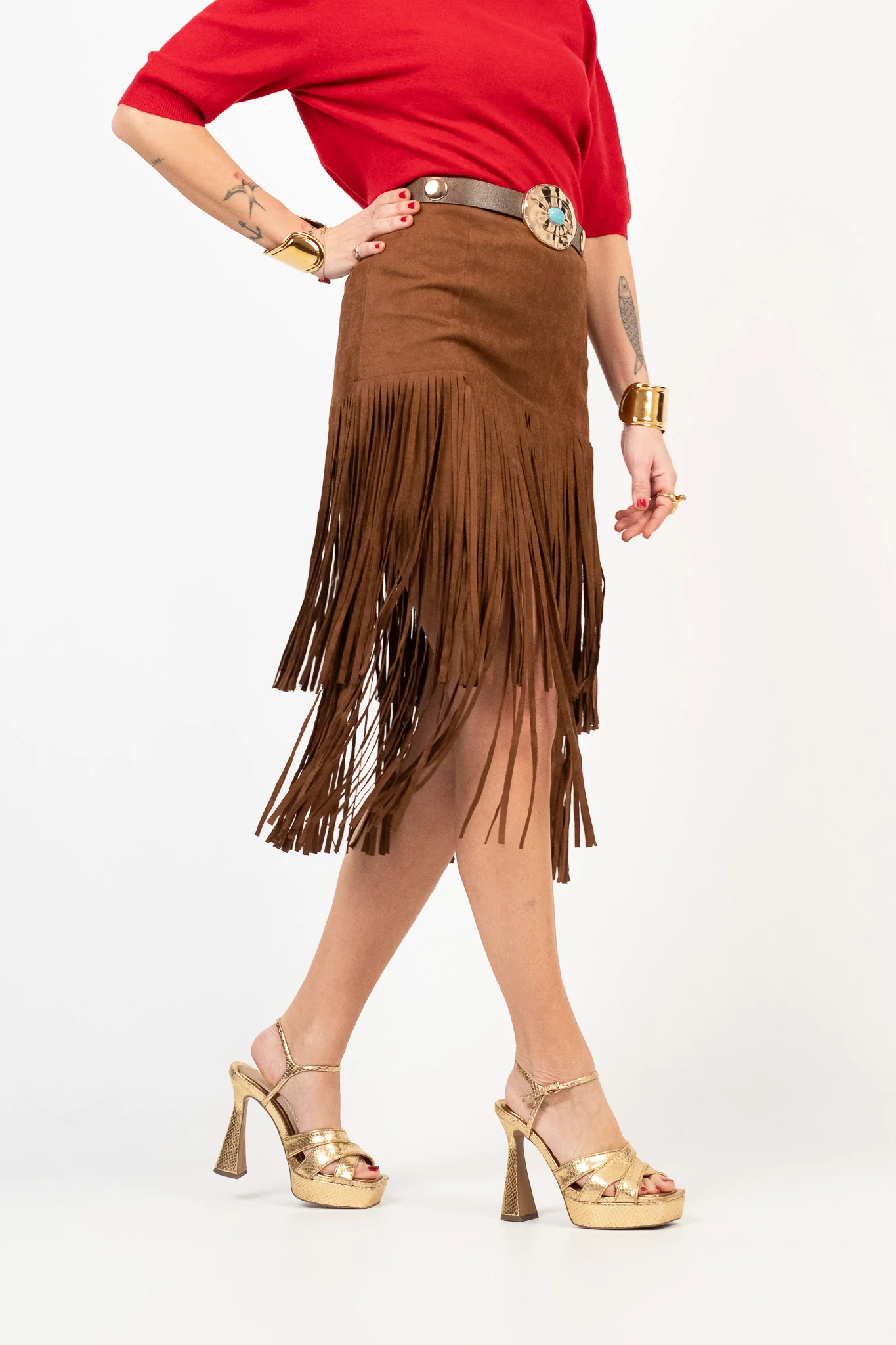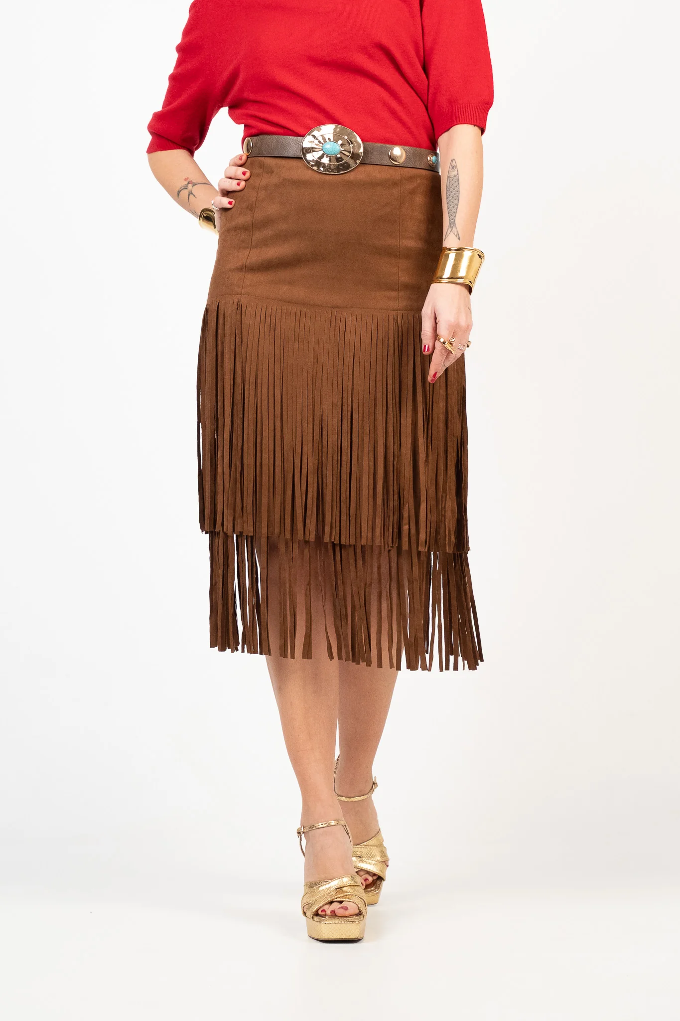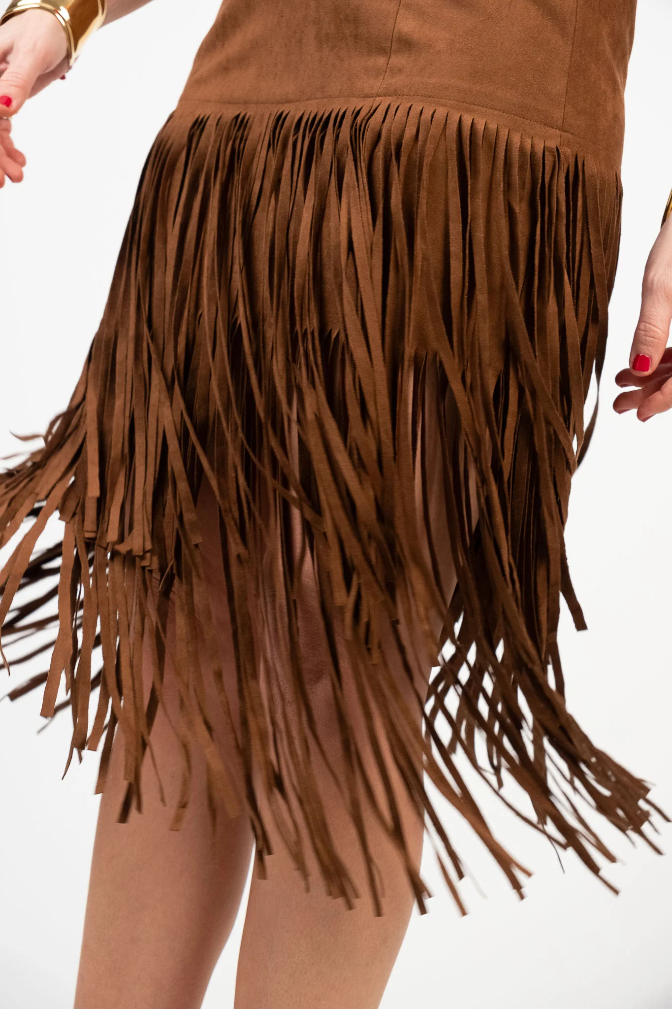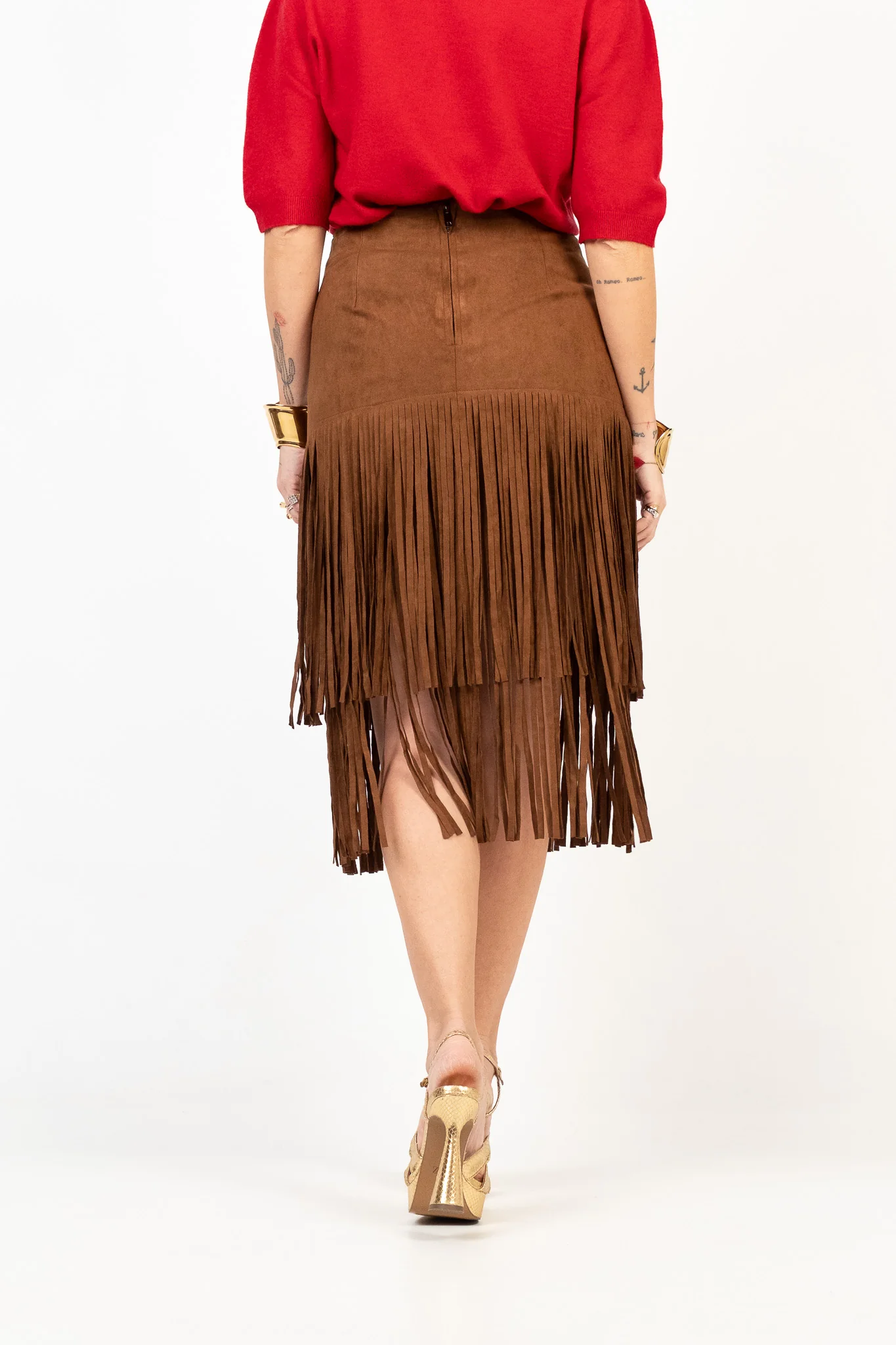 Gonna a tubino effetto suede con frange sovrapposte. Chiusura posteriore con zip a scomparsa, vita alta confortevole. La gonna non ha le tasche. Lunghezza midi. Pesantezza media. Tessuto non elasticizzato. Lile indossa la taglia S.