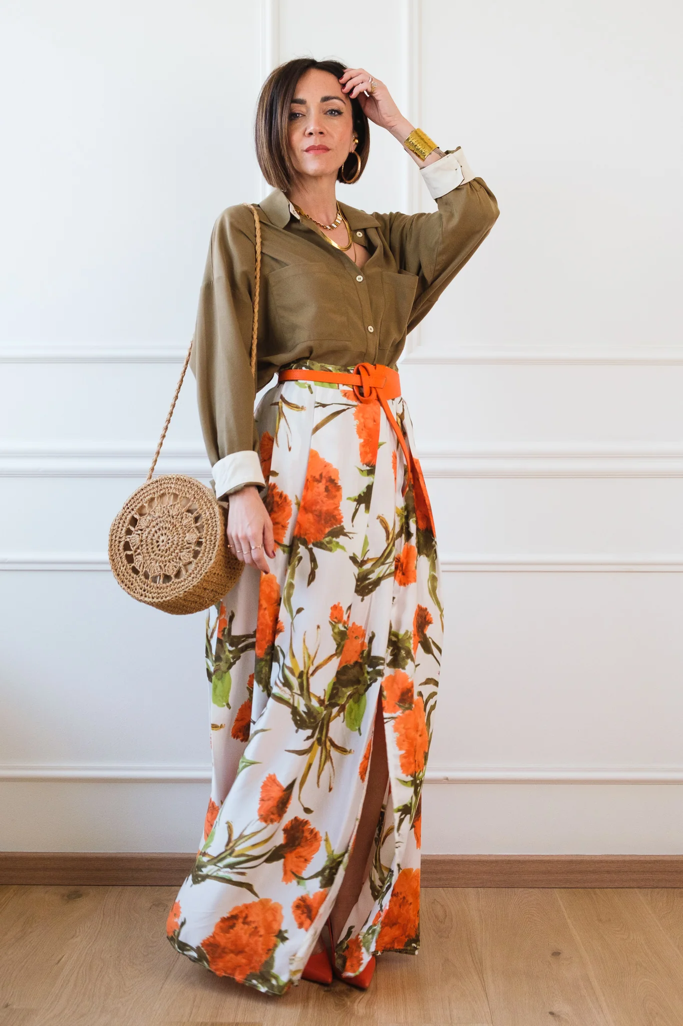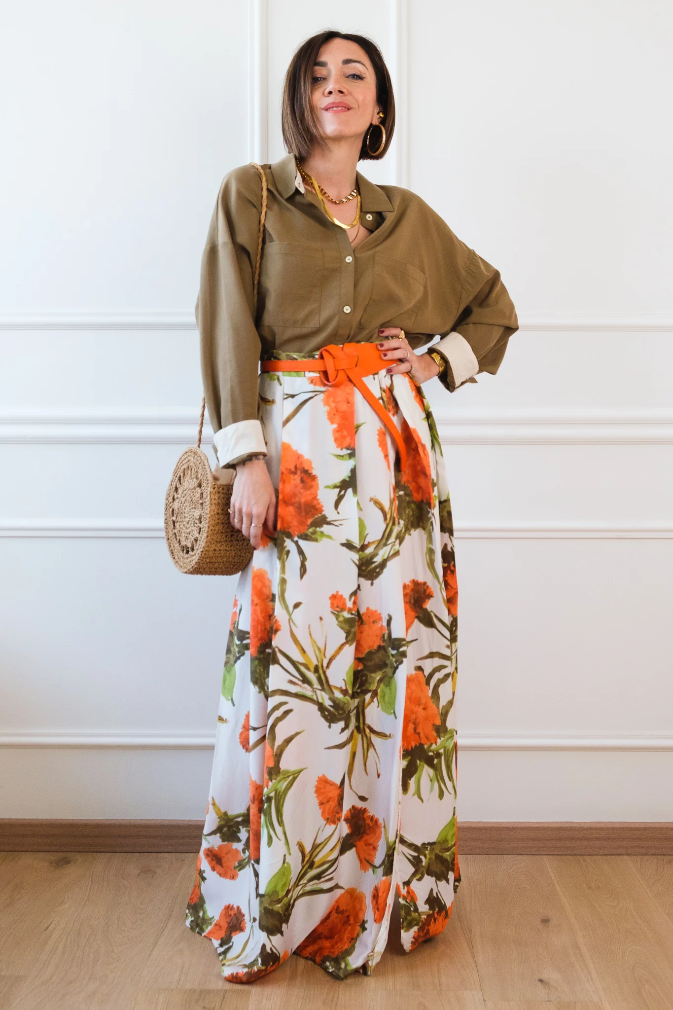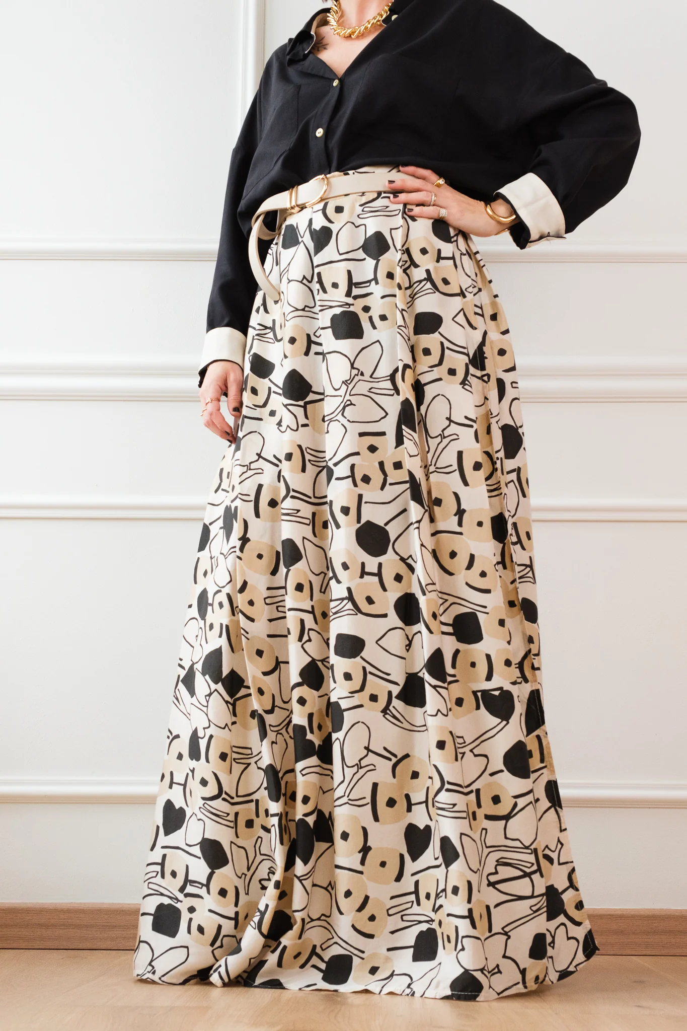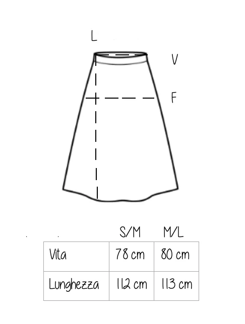 Composizione: 100% viscosa. La gonna ha la chiusura a portafoglio con i bottoni.