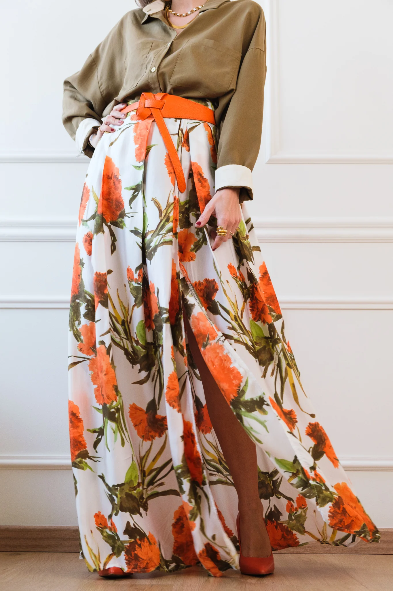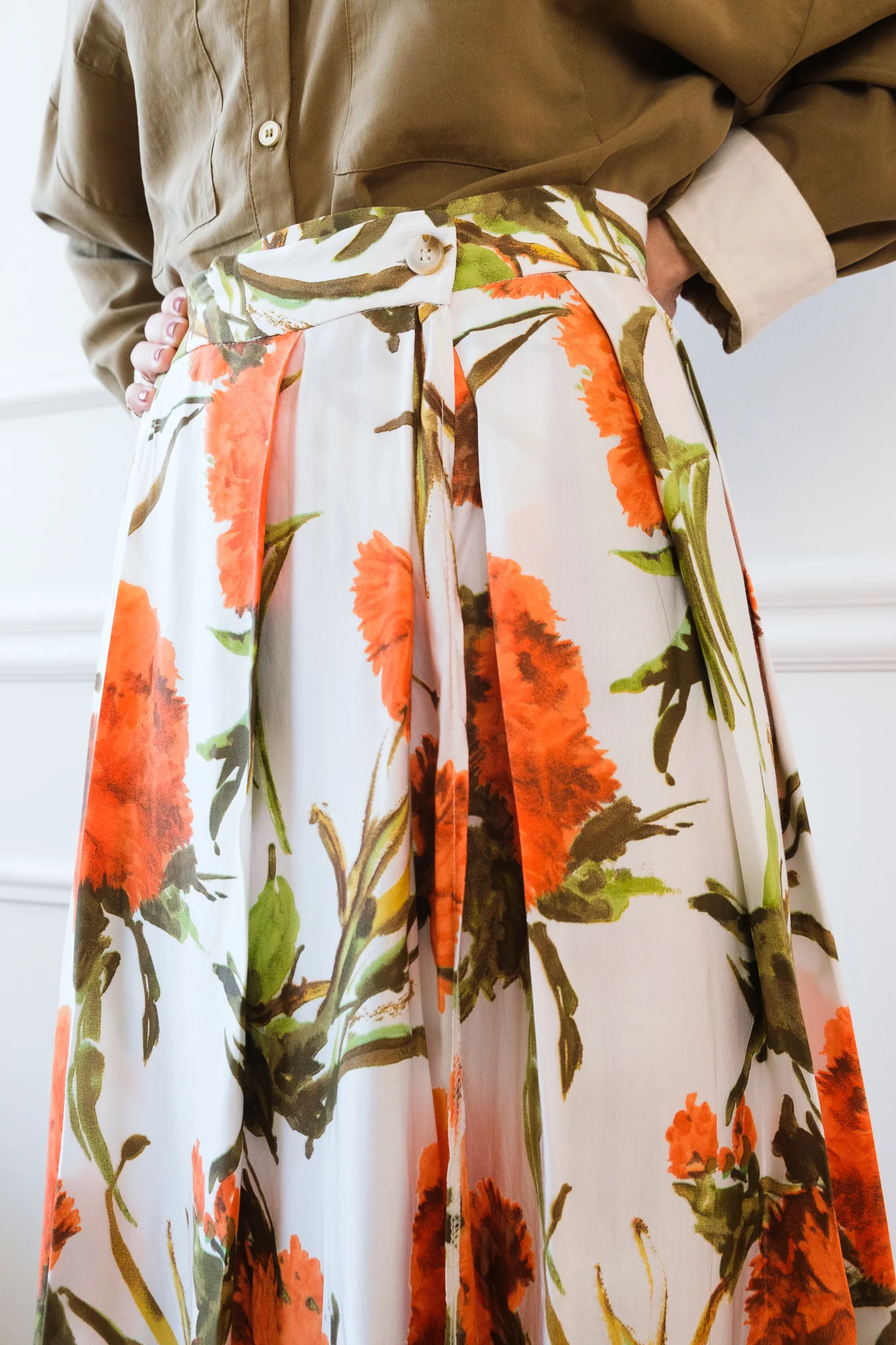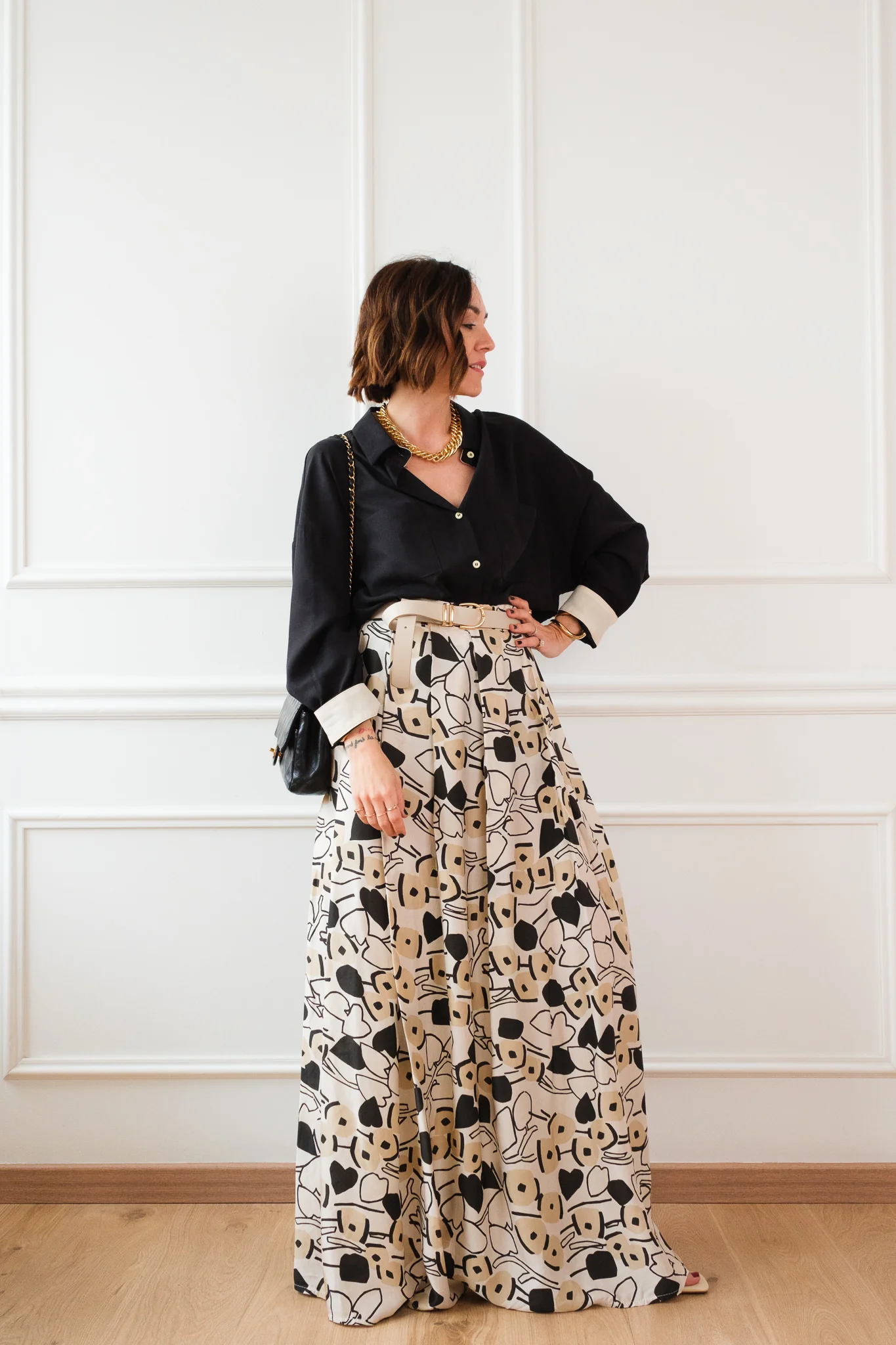 La gonna ha la chiusura a portafoglio con i bottoni.