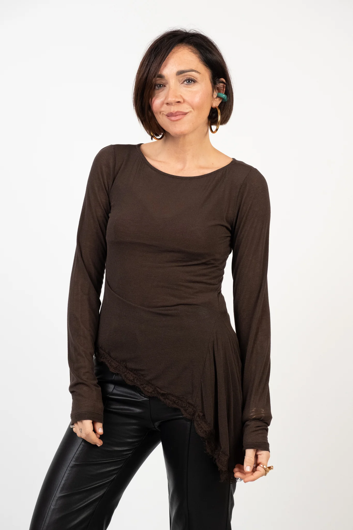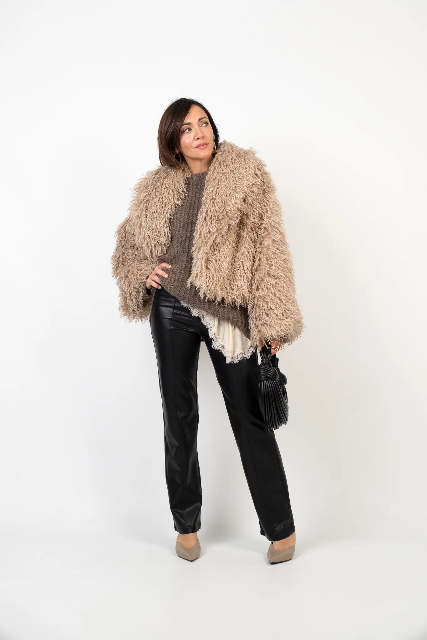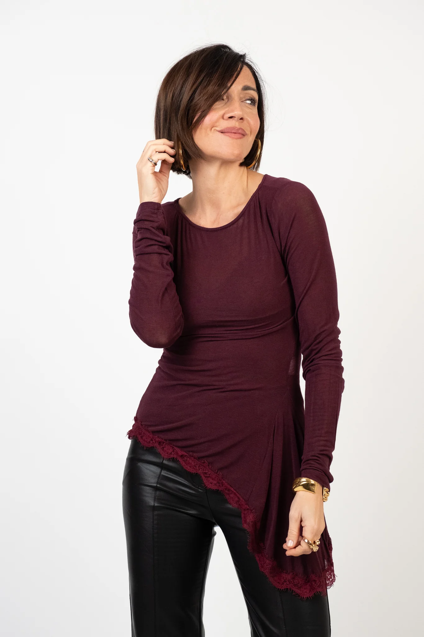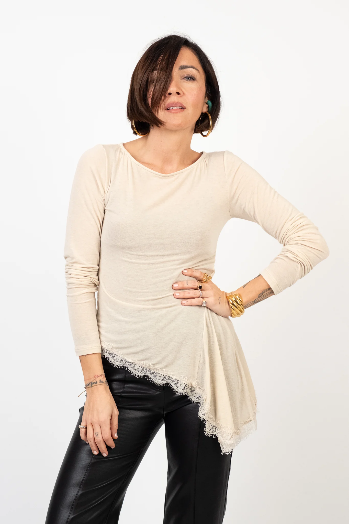 Composizione: 80% viscosa, 9% poliammide, 6% elastan, 5% cachemire. Lile indossa la taglia S/M.