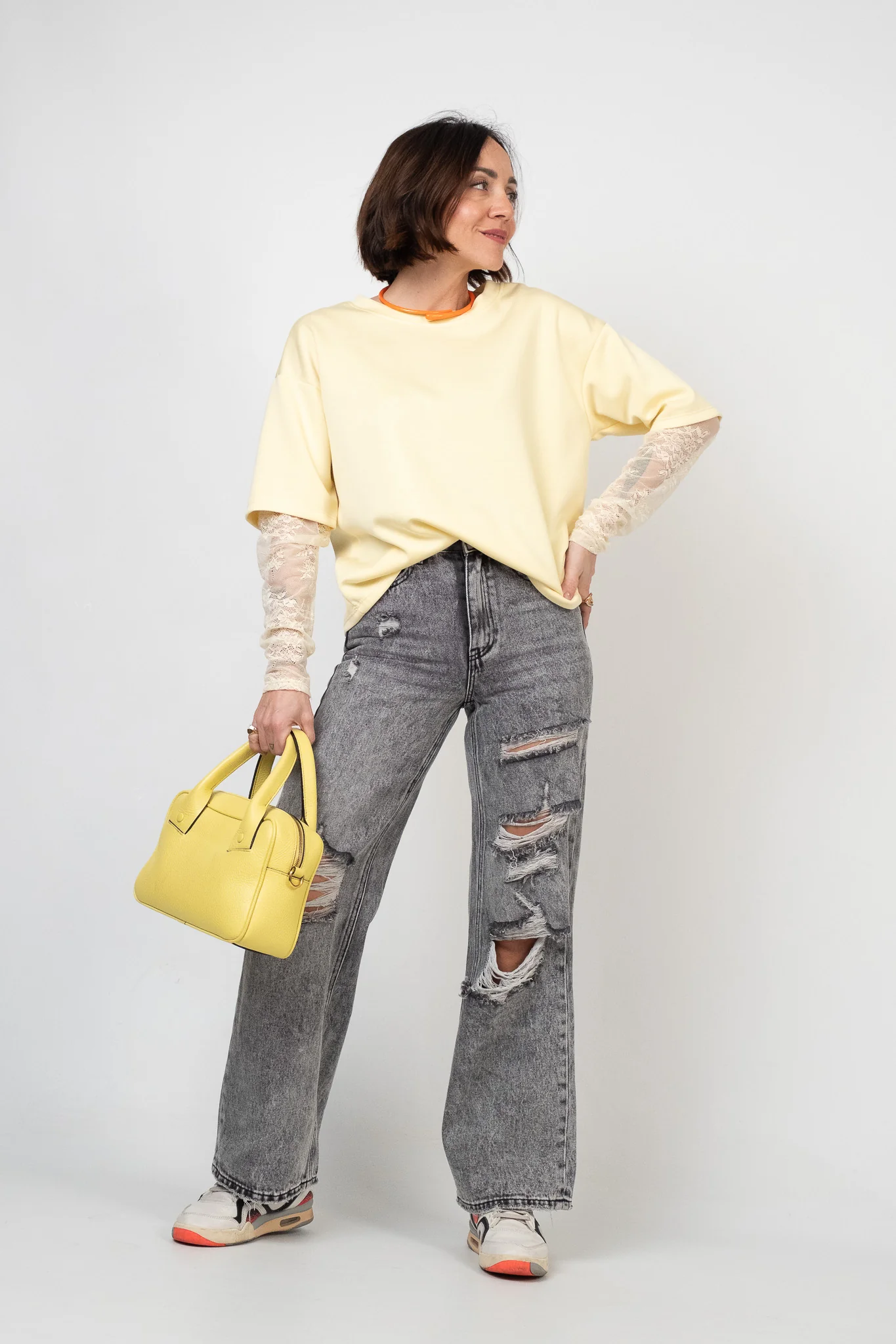 LIle’s tip: abbina la maglia a un pantalone culotte nero o blu dal tessuto tecnico cadente. Scegli un taglio ampio che crei una silhouette a “A”, richiamando la linea boxy della maglia. Completa con una sneaker o con un mocassino in pelle.