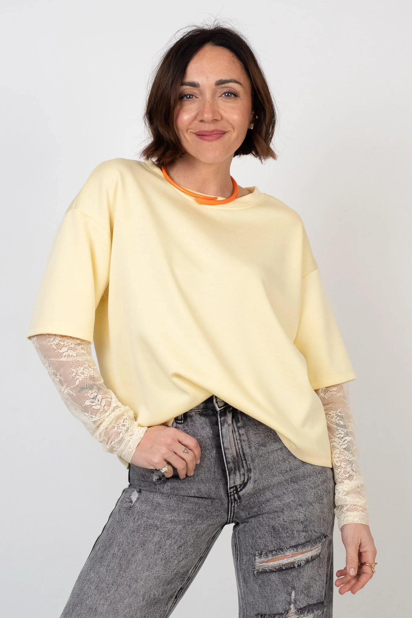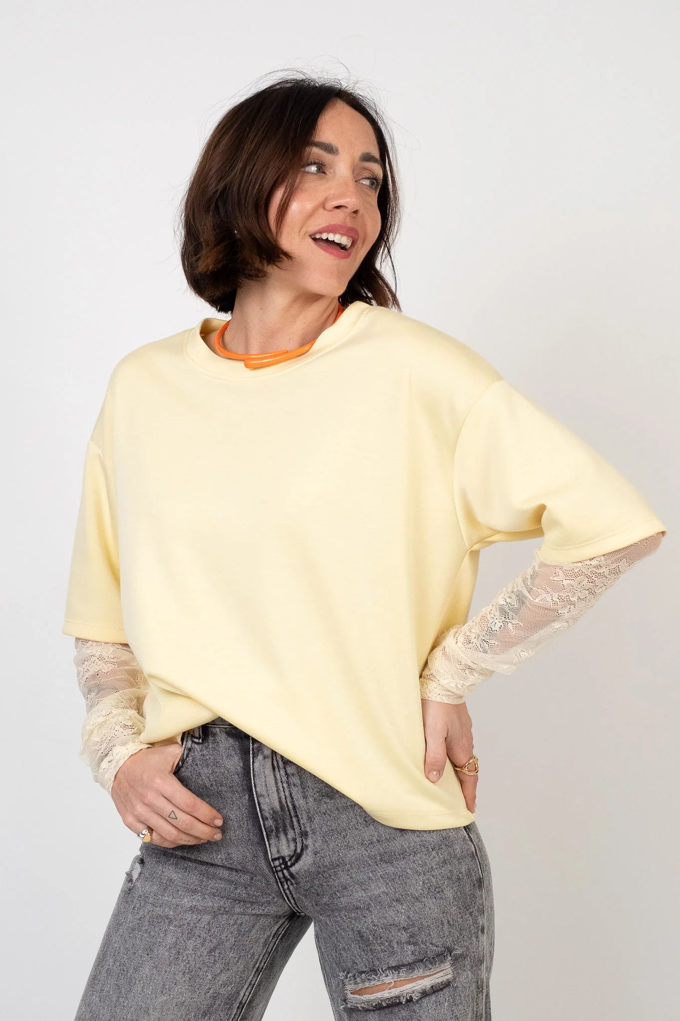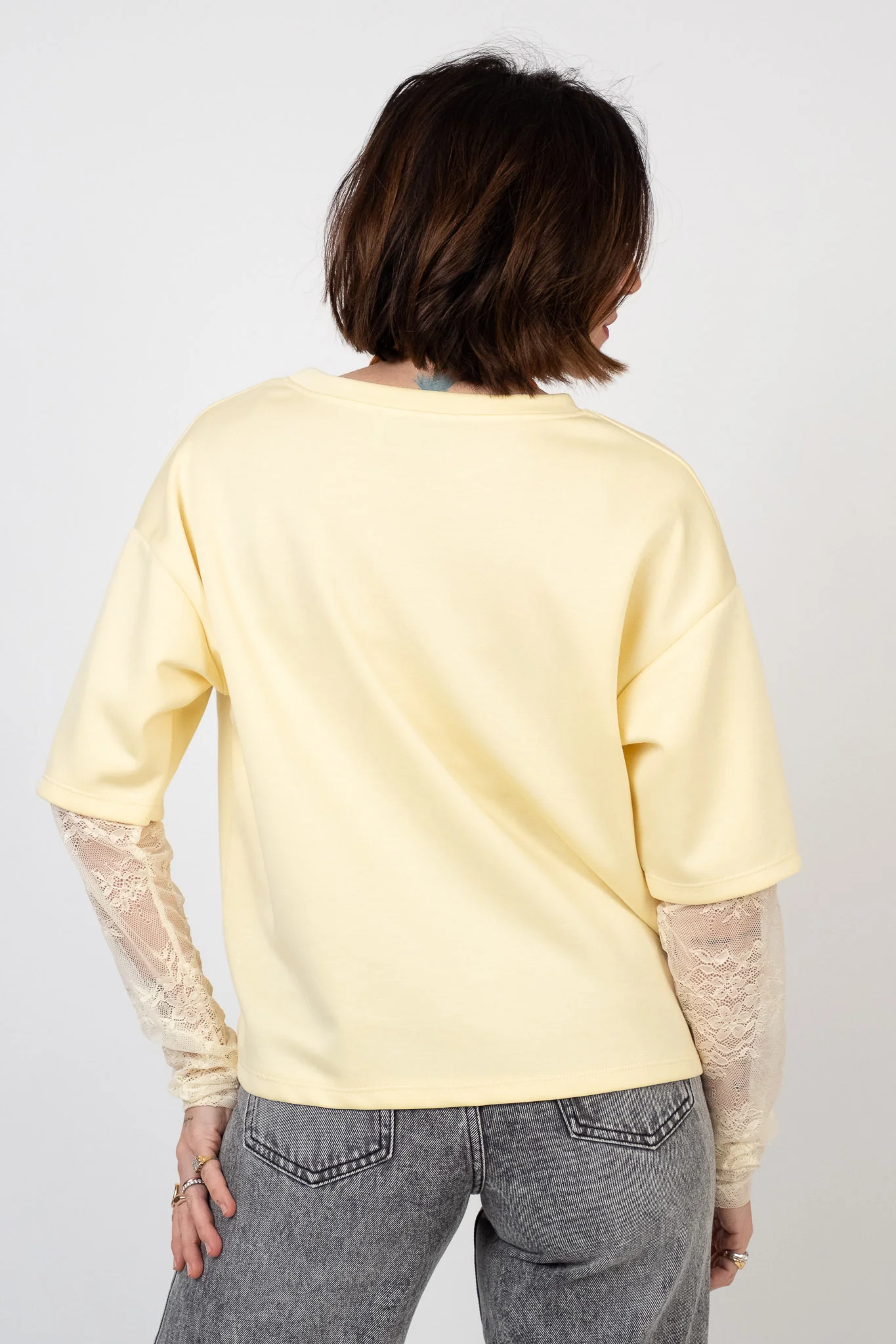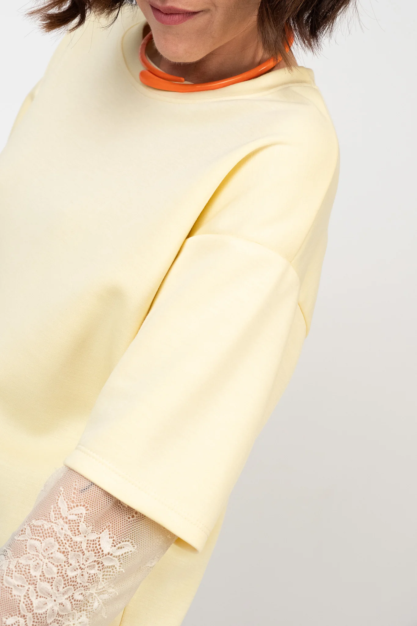 Maglia in tessuto scuba. Taglio moderno con doppia matericitร . Scollo rotondo pulito senza costine. Silhouette squadrata con spalla scesa. Manica corta con inserto in pizzo floreale stretch integrato. Pesantezza media. Tessuto liscio, elastico e antipiega. Vestibilitร over.