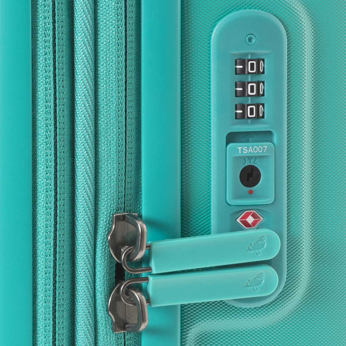 Trolley cabin rigido espandibile in policarbonato dal volume compatto e linee morbide. Presenta 4 doppie ruote in tono di colore che garantiscono migliore mobilità, protezioni d’urto in gomma personalizzate e piedini laterali antigraffio. La maniglia logata è appiattita in modo da non incrementare le dimensioni totali. Il TSA lock è posizionato sulla parte laterale.