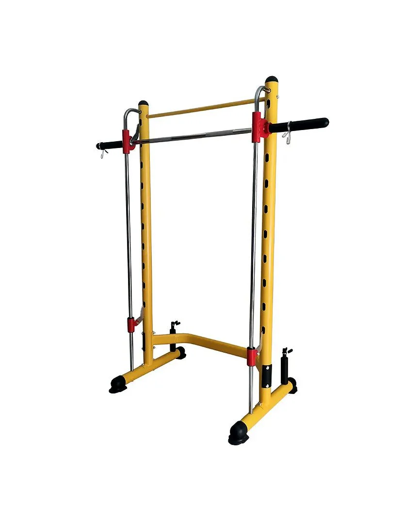 Mini Smith Machine, multipower salvaspazio autoportante ed estremamente compatto: struttura portante di soli 115×89 cm! Robusto e pratico, altezza massima 209 cm. Larghezza del bilanciere: 180 cm. Utilizzabile con dischi di foro 30 mm o con dischi olimpici (foro 50 mm). Pin di sicurezza e 10 livelli di selezione, da 60 a 180 cm.