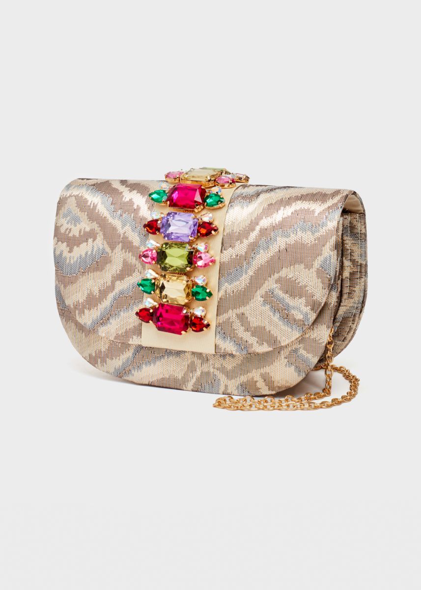 Preziosa e luccicante, la clutch in tessuto o raffia di Nalì si farà notare per il suo pattern particolare e per l’elemento gioiello composto da un mix di cristalli multicolore. Indossatela per un party, una cena, o per conferire un tocco di colore ad un look