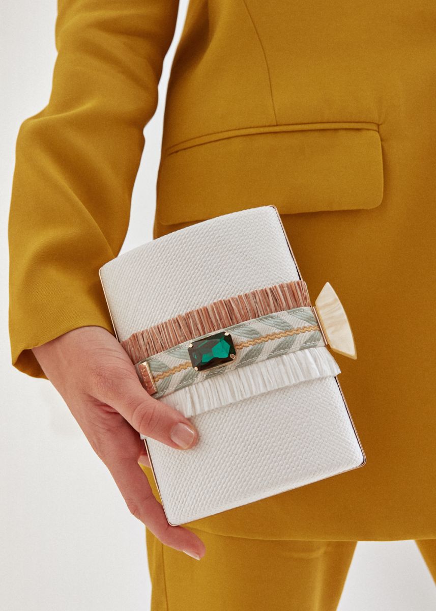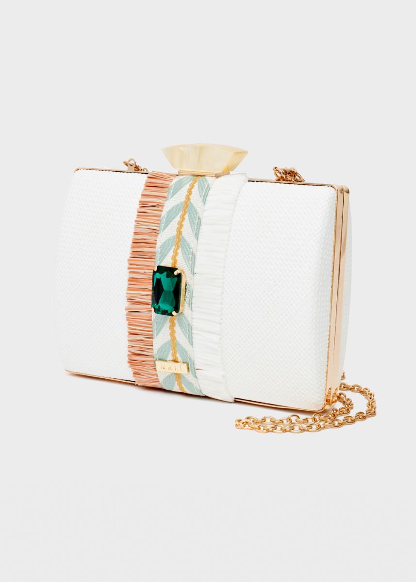 La clutch rigida di Nalì ha una silhuette formale sdrammatizzata dalla rafia e dalle frange bicolore. Al centro è incastonata una luminosa gemma e la tracolla interna vi consentirà un utilizzo cross-body. Perfetta le tue night-out estive