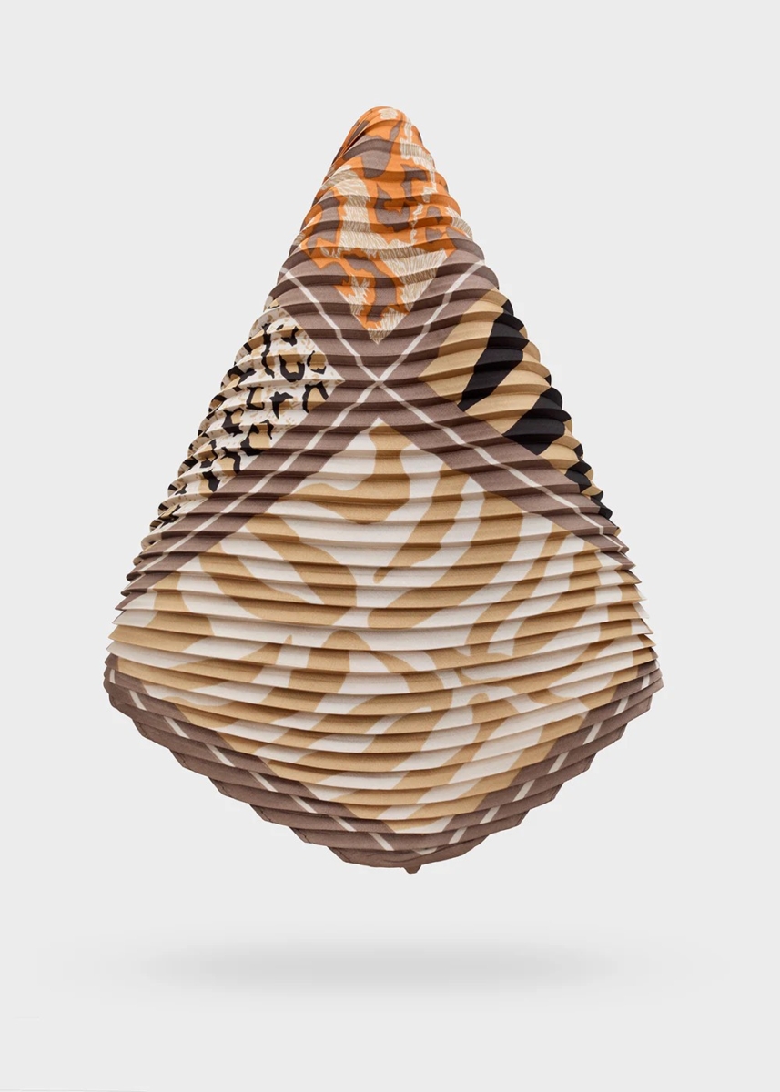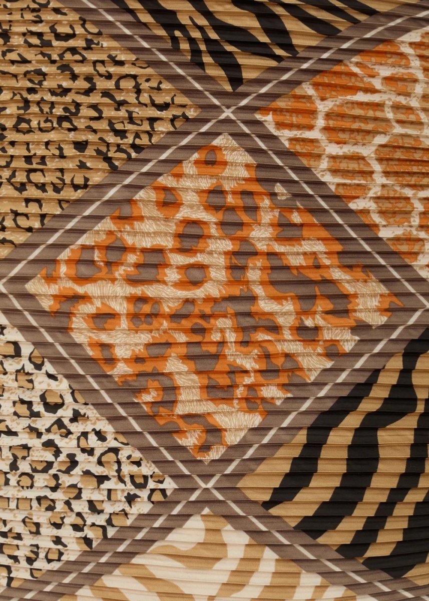 Foulard plissé con stampe animalier mixate nei toni del beige e nero. Un accessorio grintoso e versatile che dona carattere al look indossato al collo, tra i capelli o su una borsa.