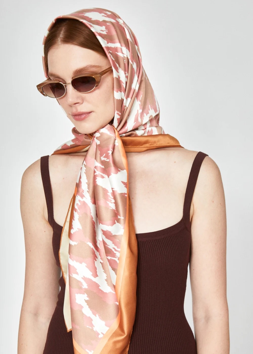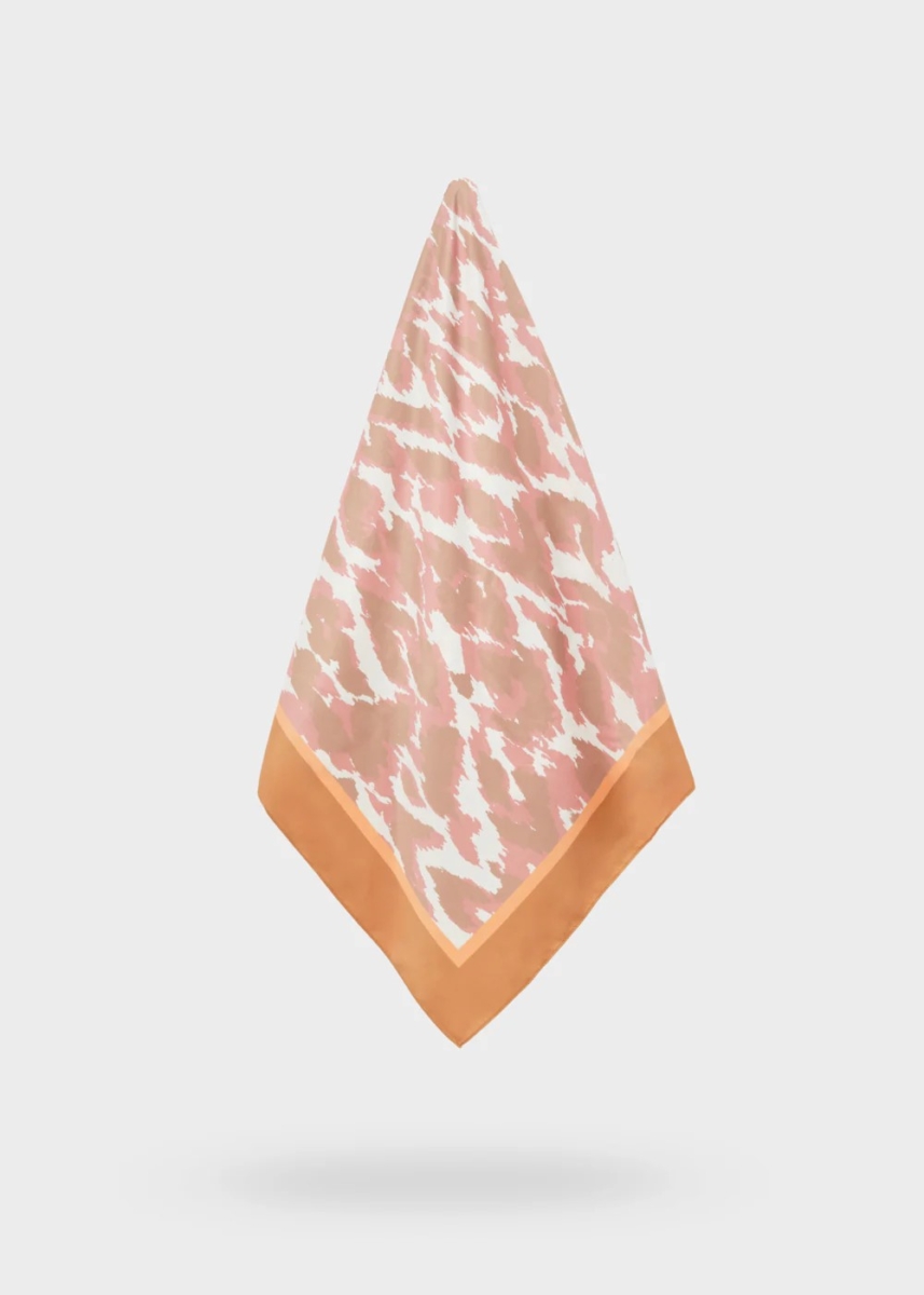 Foulard dai colori caldi e fantasia animalier in tessuto lucido.