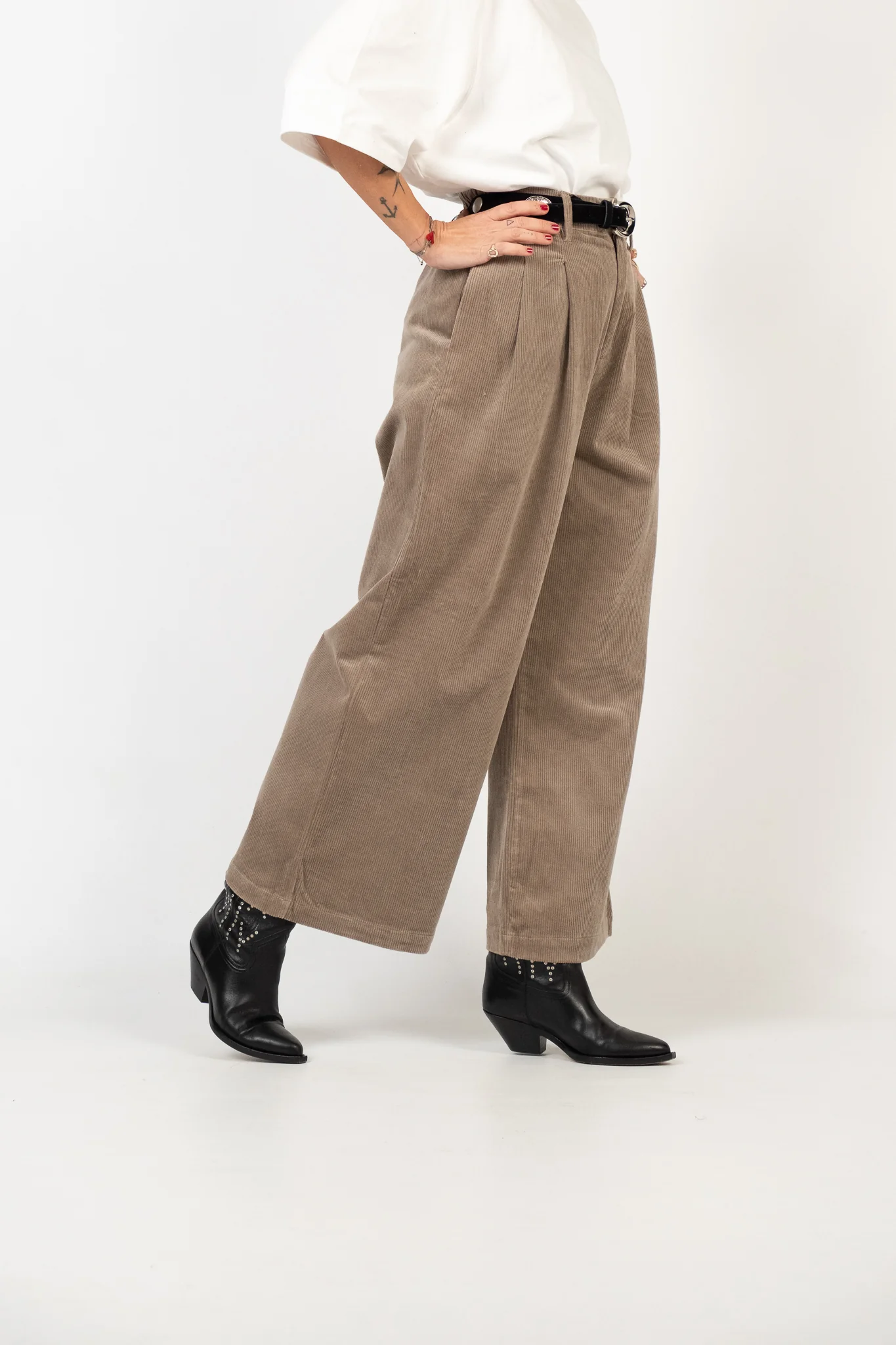 Composizione: 97% cotone, 3% elastane. Il pantalone ha l’elastico in vita. Lile indossa la taglia S.
