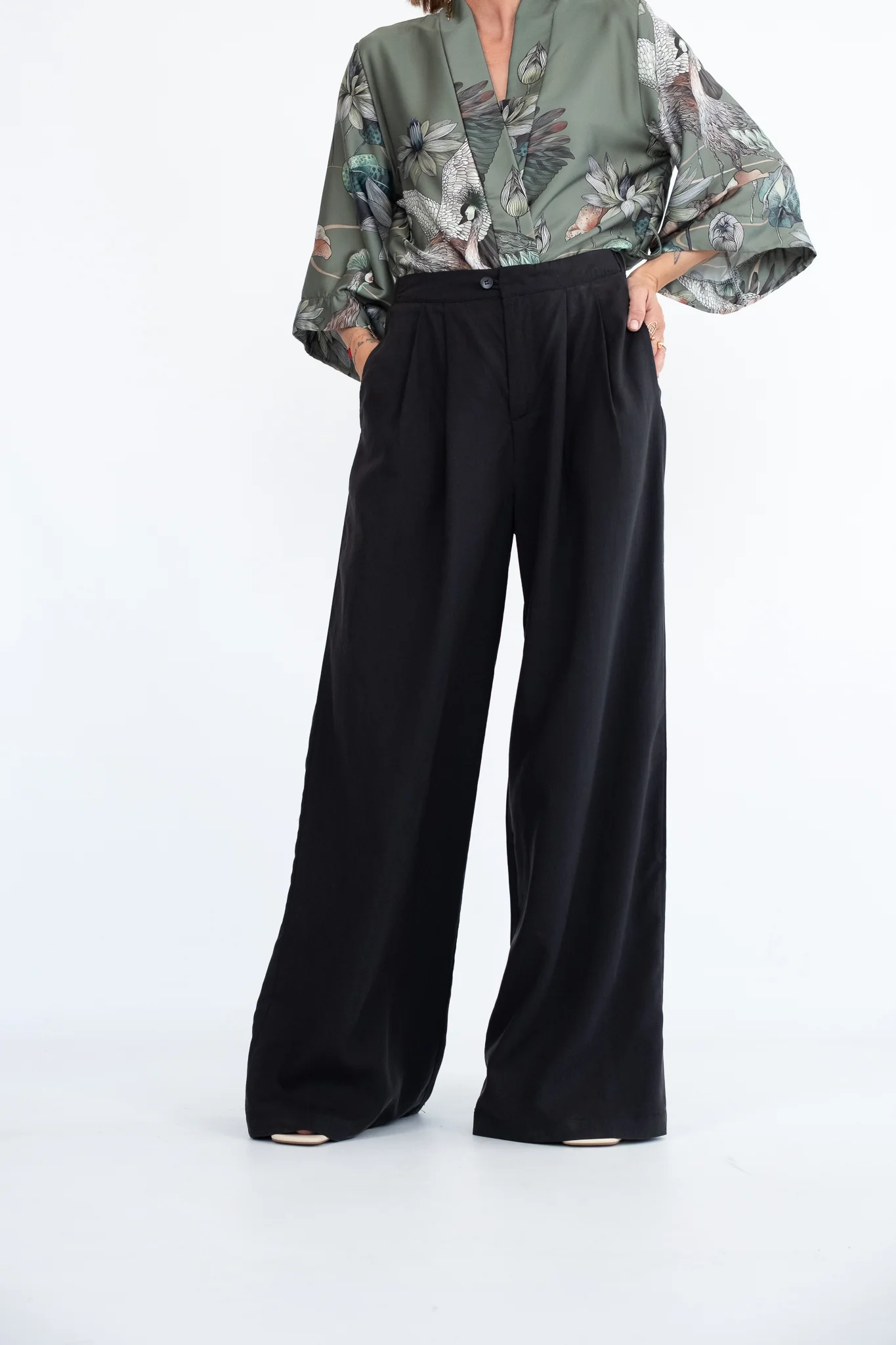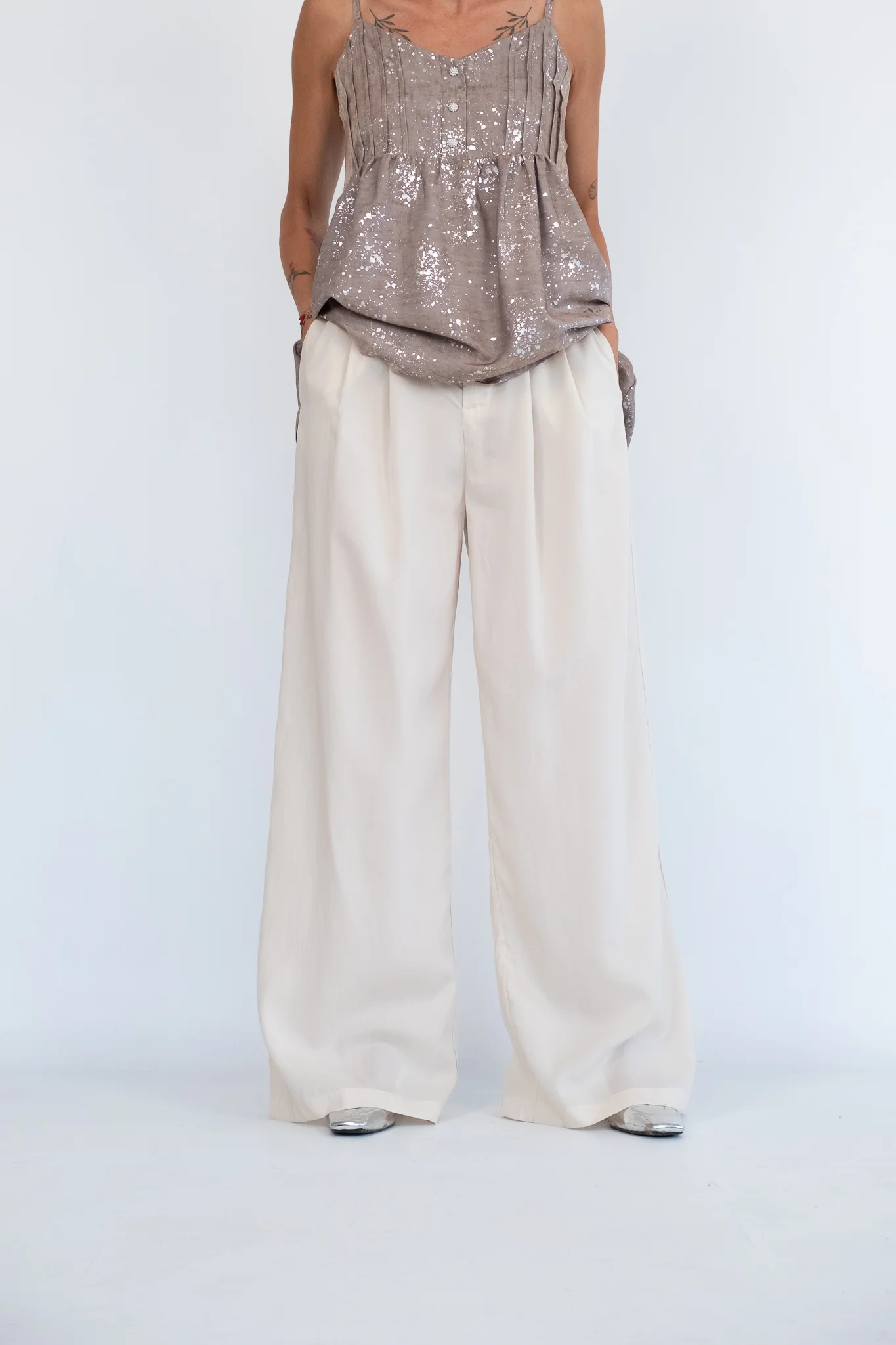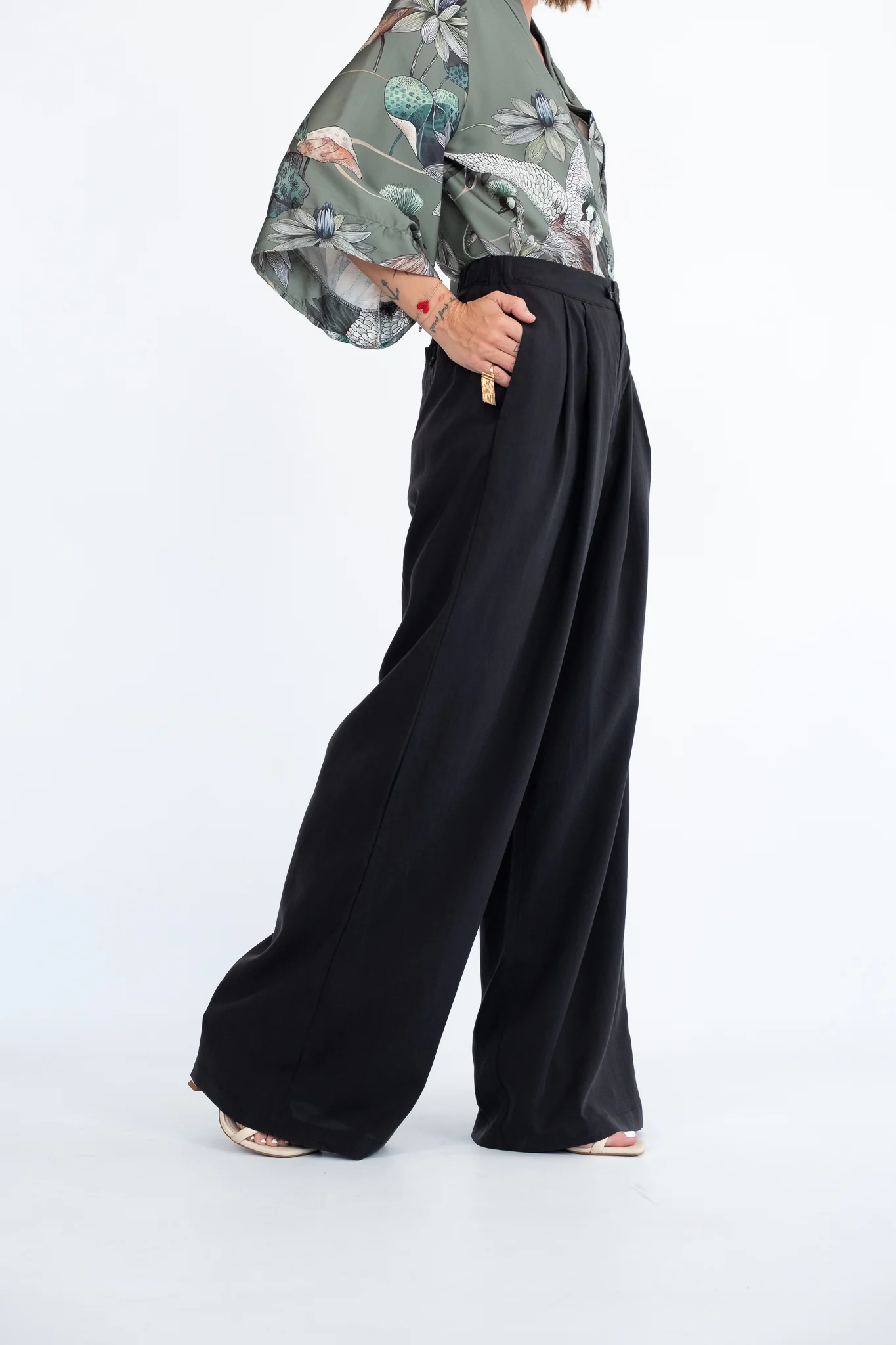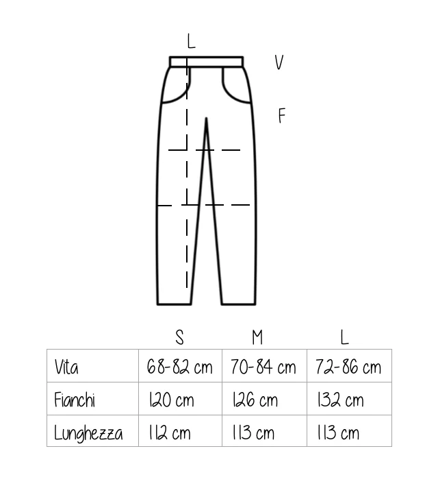 Composizione: 100% tencel. Il pantalone ha l’elastico in vita. Lile indossa la taglia S.
