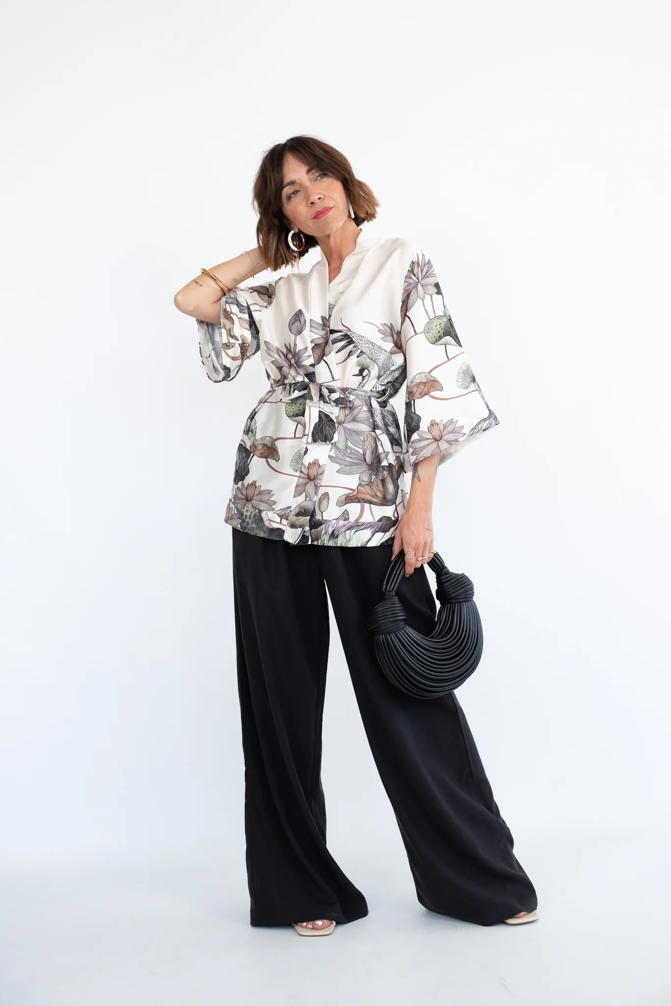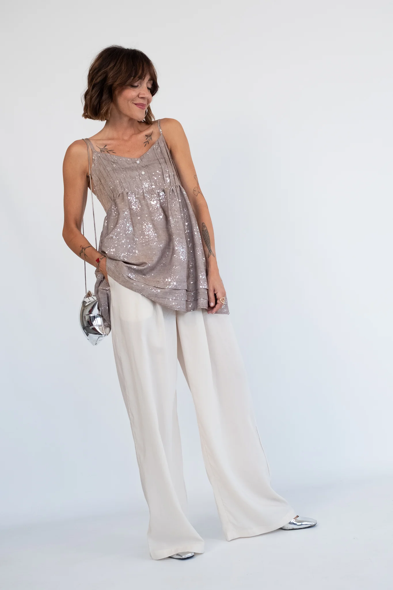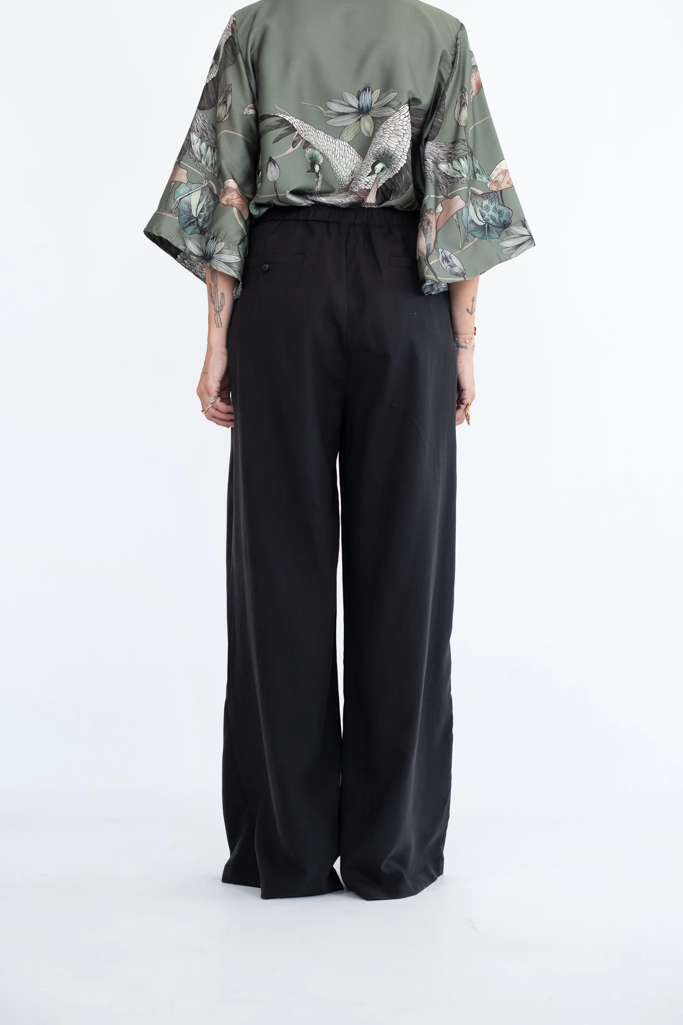 Composizione: 100% tencel. Il pantalone ha l’elastico in vita. Lile indossa la taglia S.