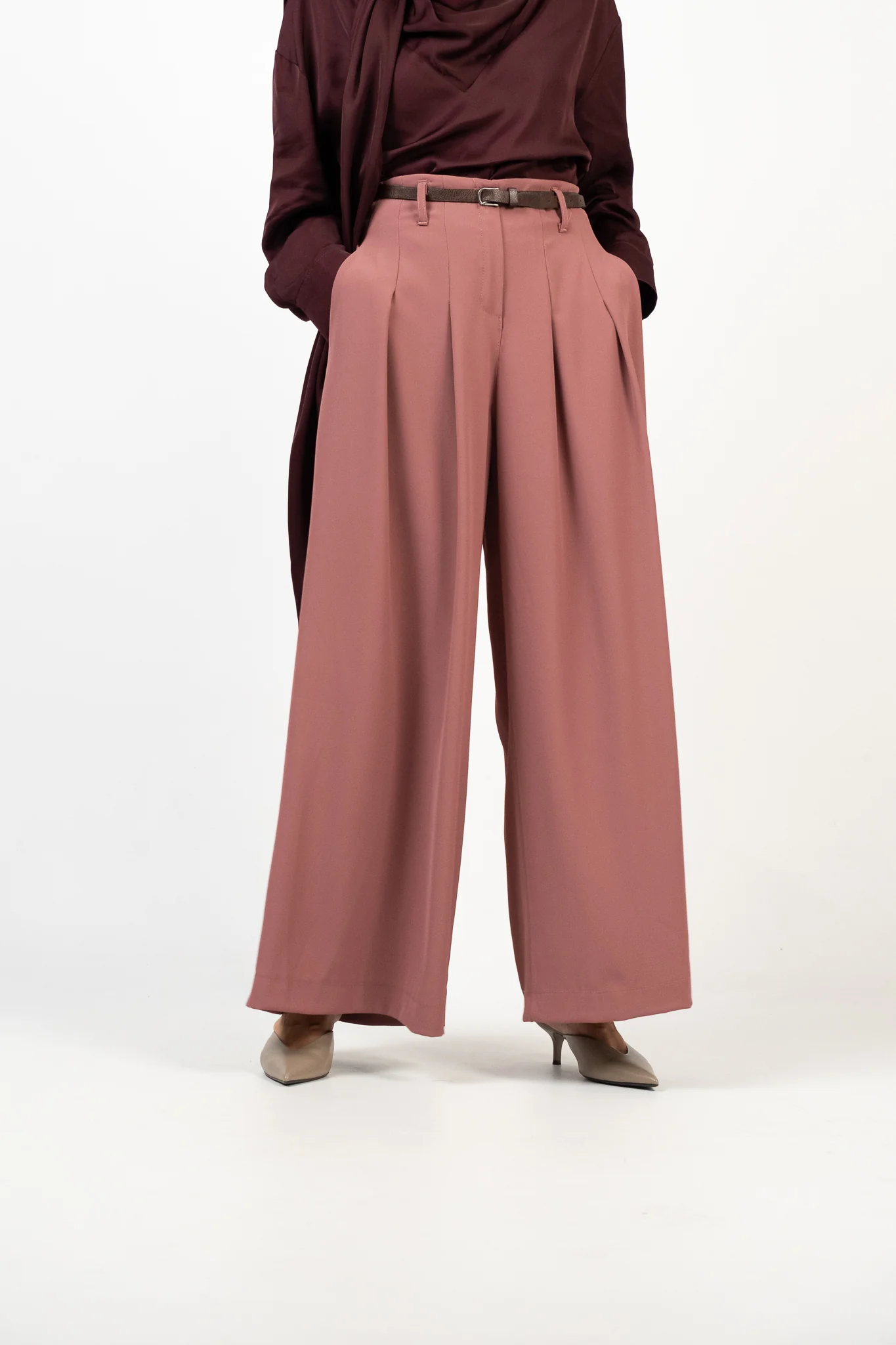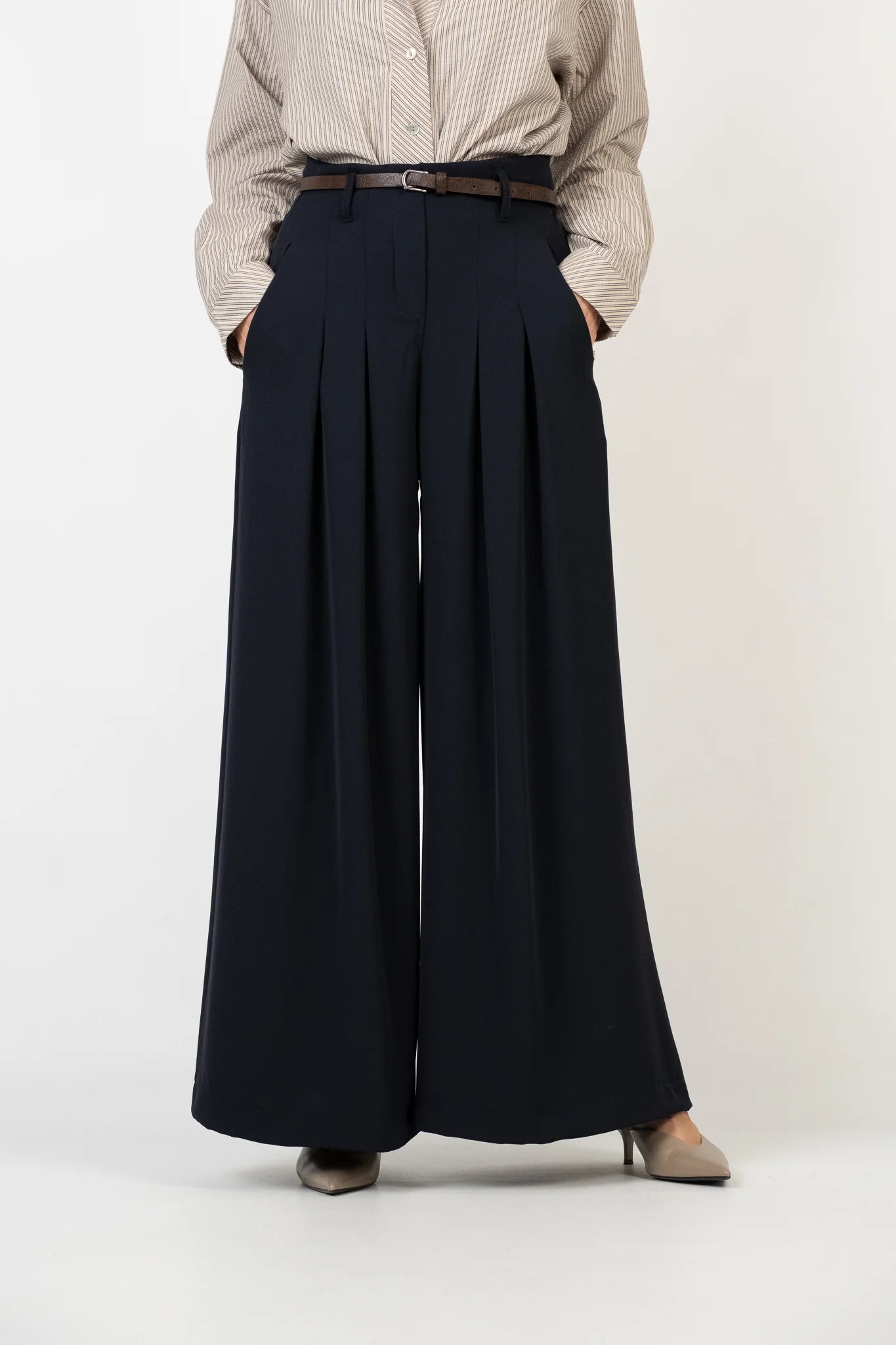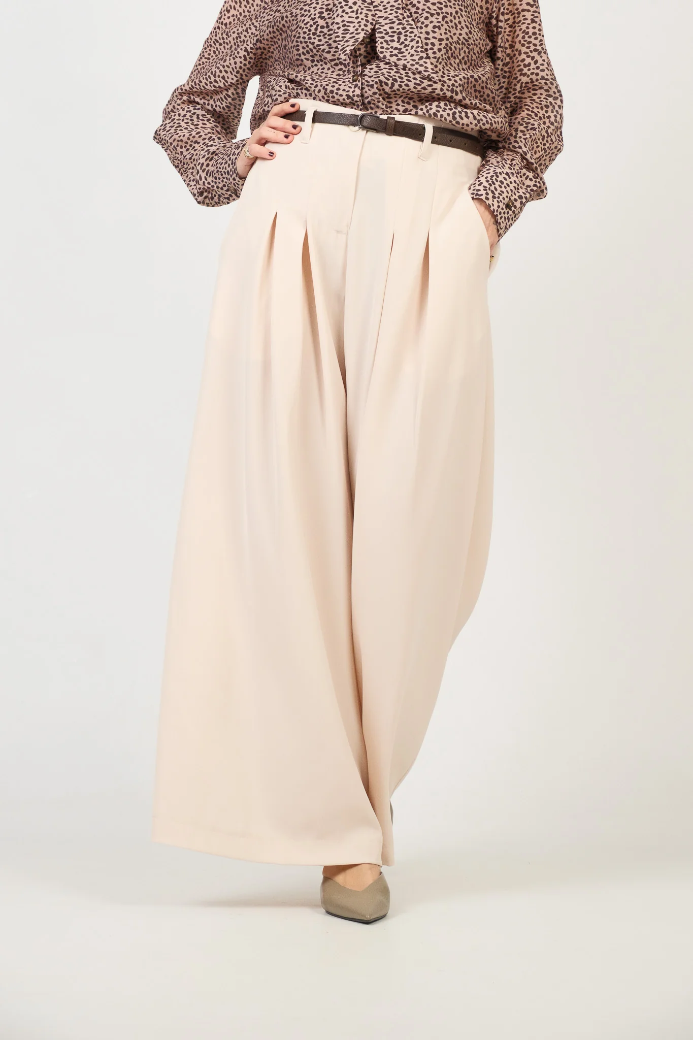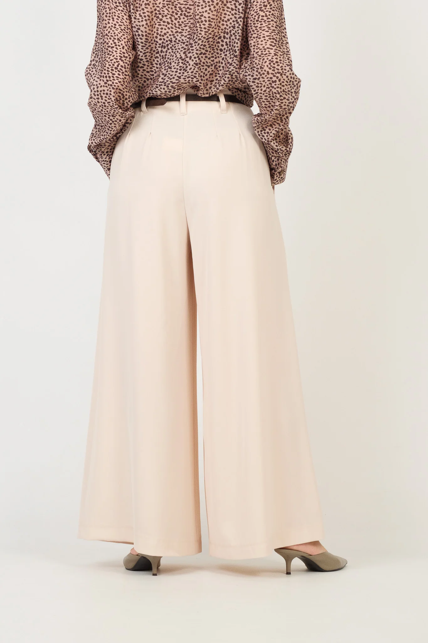 Pantalone a gamba larga in tessuto fluido dal design sofisticato con vita alta. Chiusura frontale con zip e bottone. Doppia pinces profonda per un volume ampio e strutturato. Taglio extra wide a palazzo. Passanti in vita per cintura sottile. Tasche laterali inserite nella cucitura. Pesantezza media. Senza fodera interna. Tessuto cadente non elasticizzato. Cintura inclusa. Lile indossa la taglia S.