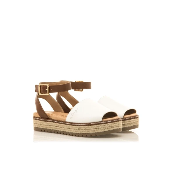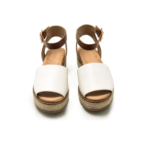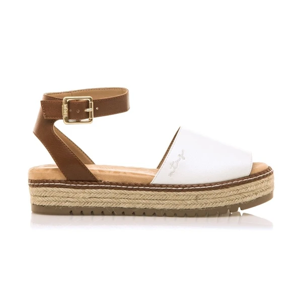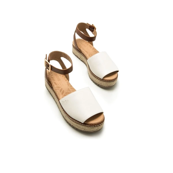 Sandali Donna MTNG AMELIE rif. 59617. Sandalo con plateau Amelie Mustang da donna in stile maiorchino, disegnato principalmente in bianco con sottopiede in pelle. Con cinturino color pelle che circonda la caviglia rifinito con chiusura con fibbia per un maggiore sostegno. La sua piattaforma è realizzata con la tradizionale treccia di iuta. Suola dentata per un passo più stabile, altezza 7 cm.