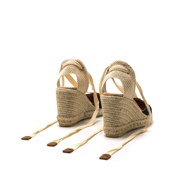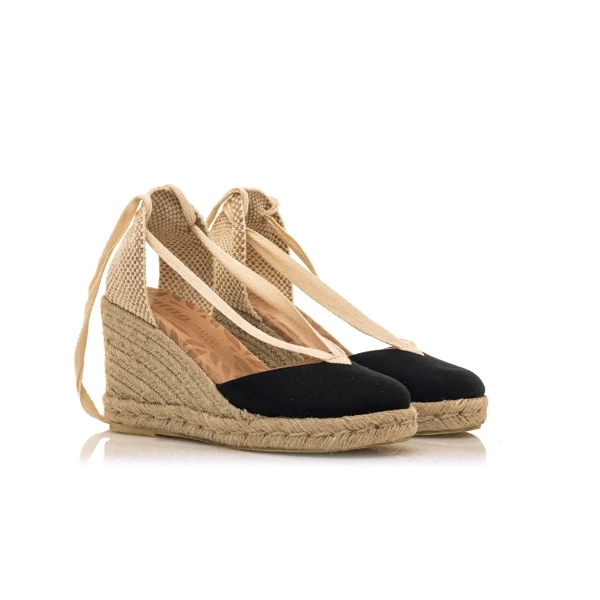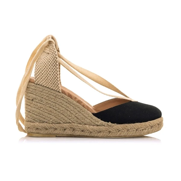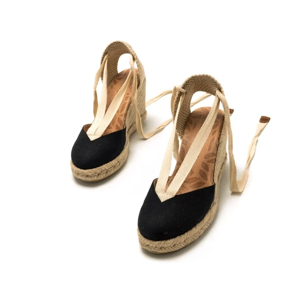Sandali Donna MTNG LOUISA rif. 51995. Sandalo Louisa Mustang da donna, realizzato in nero con sottopiede in pelle. Ha un originale design intrecciato di iuta lungo la zeppa. Punta chiusa e tallone aperto. Chiusura con cinturino per poterlo allacciare alla caviglia. Altezza tacco 7 cm.