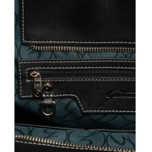Chiusura borsa: pannello con zip, parti metalliche e loghi in metalleria oro con logo Gattinoni e borchie G logate.