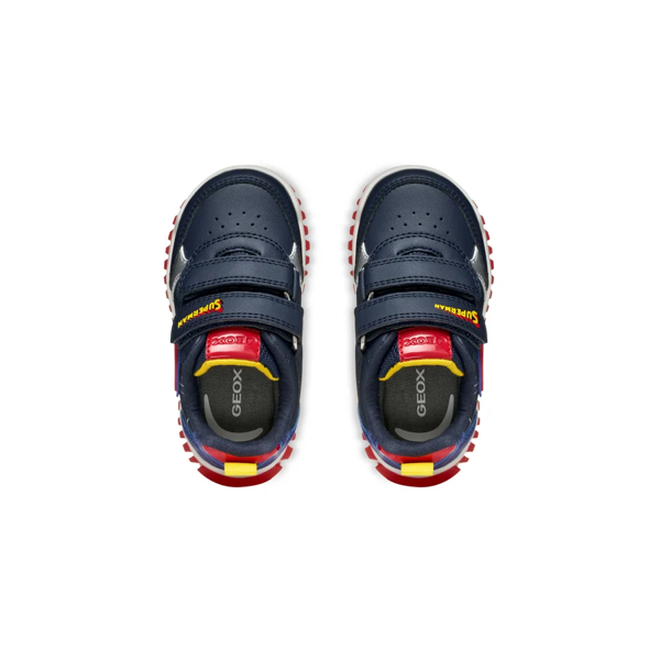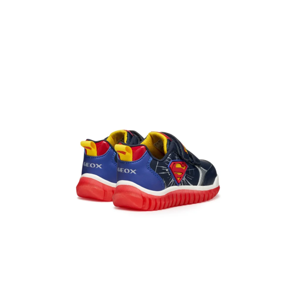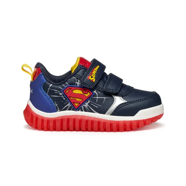 Sneakers Bambino Geox Lightyloo colore navy B565ZB 000BC C4226. Le sneakers per neonato Geox Lightyloo in una vivace combinazione di blu navy e royal blu sono l’ideale per i primi passi, unendo stile, comfort e un tocco di avventura. Questa speciale edizione, nata dalla collaborazione tra Geox e Warner Bros, è ispirata al supereroe Superman e rende ogni momento di gioco ancora più magico grazie alle luci integrate nella suola.