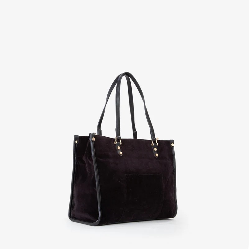 Shopping bag realizzata con materiale effetto camoscio e impreziosita da un ricamo punto spugna.