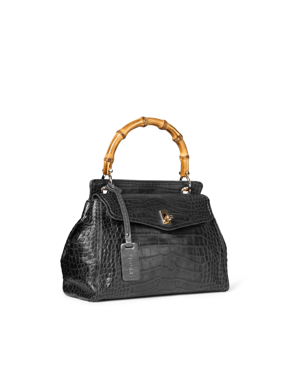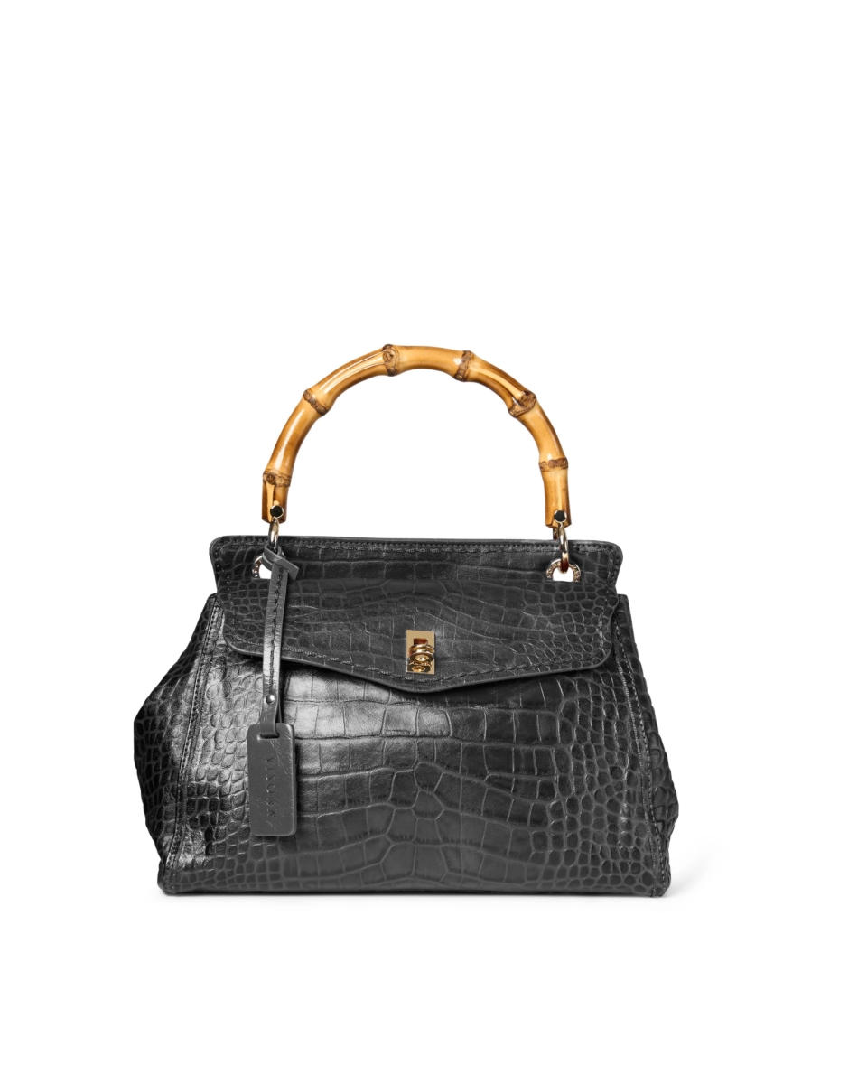 Scopri la linea Miami. Questa borsa può essere portata a mano o a spalla grazie alla tracolla rimovibile. Le cuciture distintive e i dettagli in bamboo aggiungono un tocco di eleganza. 100% Made in Italy.